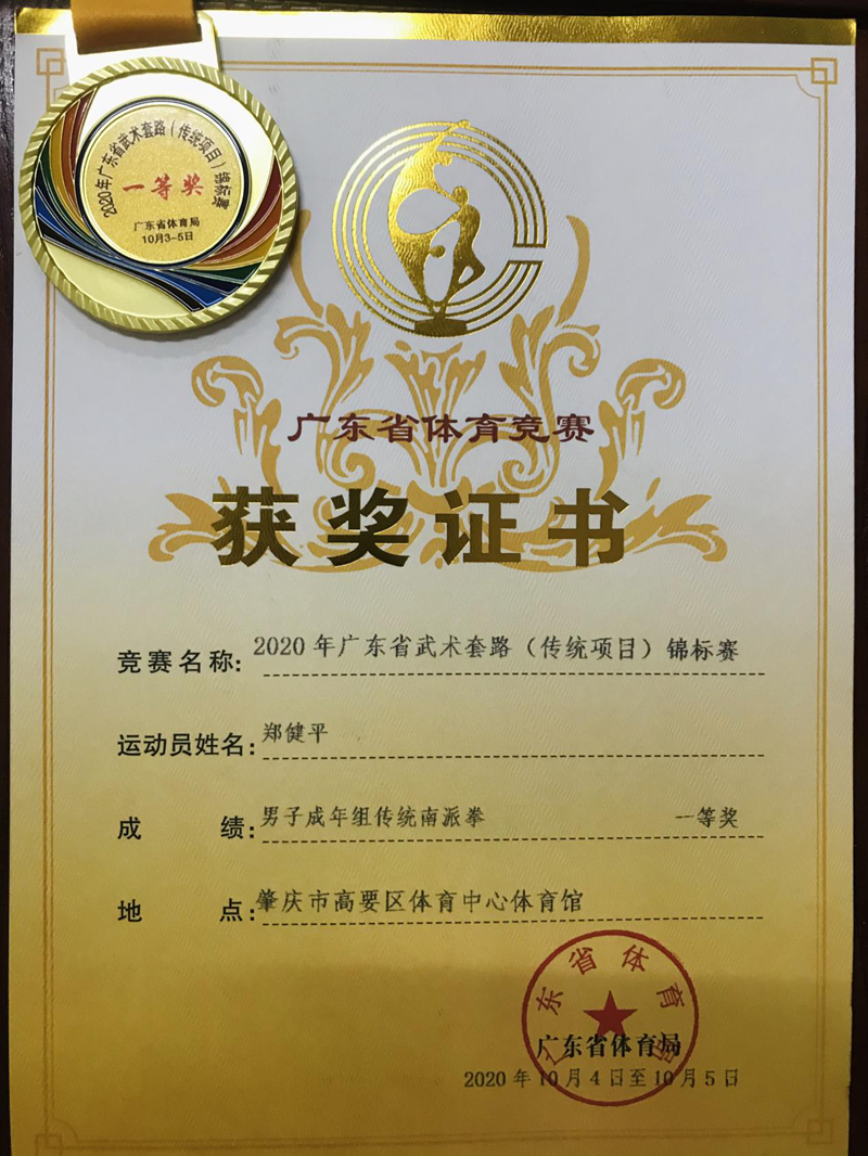 10月3至5日,由广东省体育局主办的广东省武术套路(传统项目)锦标赛在肇庆市高要体育中心举行,我校2018级社会体育系学生郑健平在这场“武林之争”中,夺得成年组传统南派拳一等奖,同时夺得成年组传统南长派器械二等奖的好成绩。