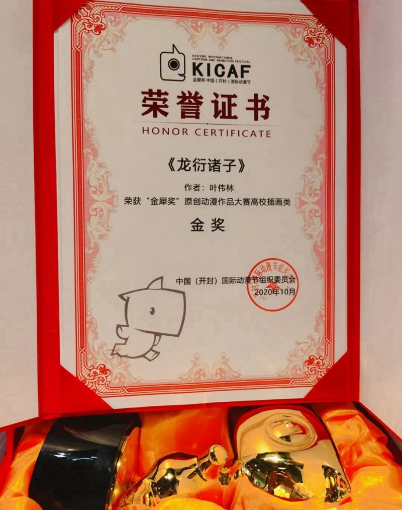 用动漫语言讲好中国故事,据了解,金犀奖·中国(开封)国际动漫节以“纯净动漫初心,漫动多彩未来”为永久性主题,以“金犀同行”为子题,在推动动漫产业繁荣发展的同时,也推动着优秀传统文化以昂扬的、新颖的姿态展露在更多人的面前。我校艺术与传媒系16级动画专业叶伟林(笔名:唐童)以作品《龙衍诸子》荣获“金犀奖”原创动漫作品大赛高校插画类金奖。