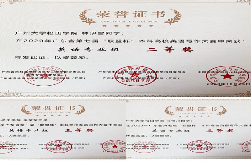 近日,在广东省第七届“联盟杯”本科高校英语写作大赛决赛中,我校外语系学生林依雪同学荣获英语专业组二等奖,冯怡丹、梁莹莹同学荣获英语专业组三等奖。