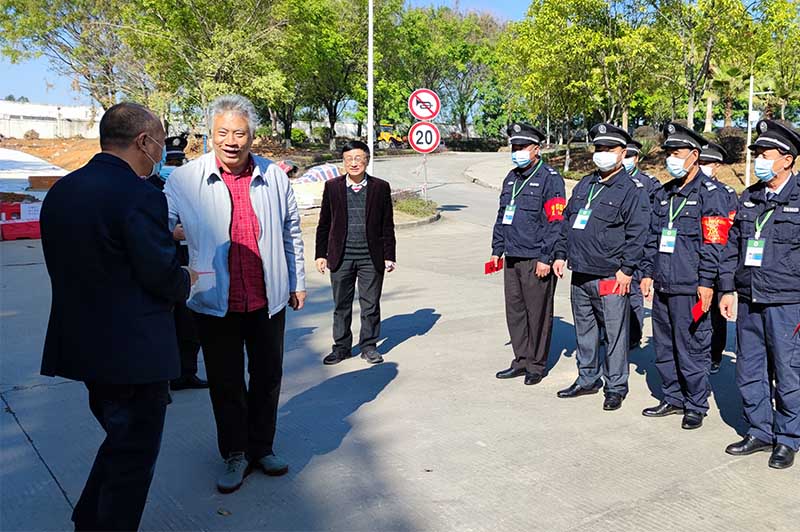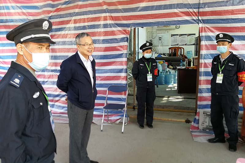 2月13日,正月初二上午,我校党委书记王永云在党委办公室主任陈贤明的陪同下,徒步走访了学校各值班点和基建工地现场,详细了解春节期间校园值班情况。在校门口值班室、在学生服务大厅,王永云书记向当天值班的保安人员拜年,询问了学校疫情防控和总体维稳值班情况,并现场调阅了值班日志台账。王永云书记强调,作为学校安保专业力量,一定要切实提高政治站位,时刻绷紧确保校园安全稳定的弦,强化政治意识和责任担当意识,认真负责,恪尽职守,认真做好疫情防控、守好校园第一道防控防线,加强来校人员车辆检查、安全巡逻、应急处突,全力维护好校园春节期间的安全稳定。