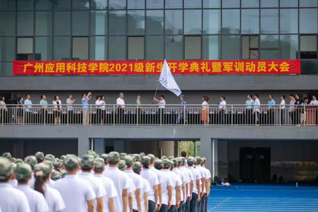 学校董事长、校长刘剑锋向2021级新生军训团授旗。校旗迎风飘扬,从这一刻起,广州应用科技学院2021级新生正式开启了大学四年的学习,肇庆校区也正式迎来了首届普高新生的大学学习。时代向前,青年向上。2021级新生的到来,为快速发展的广州应用科技学院带来了盎然生机,给予了广州应用科技学院在新的发展征程上不断追求卓越, 赓续辉煌的动力,为广州应用科技学院肇庆校区这片土地带来了新的激情。