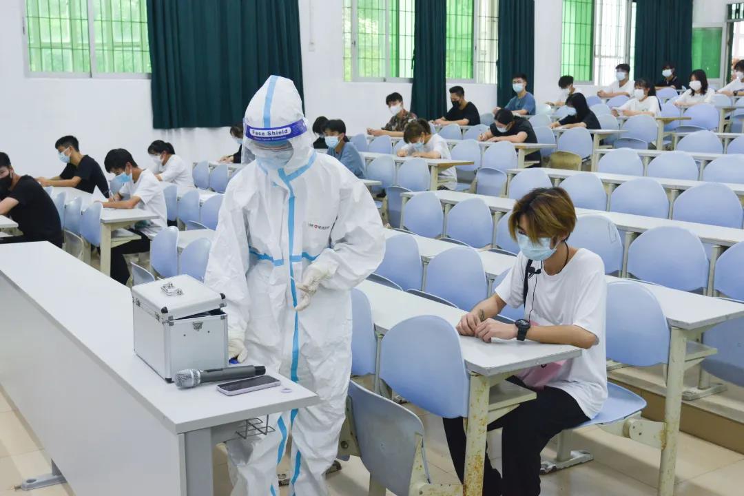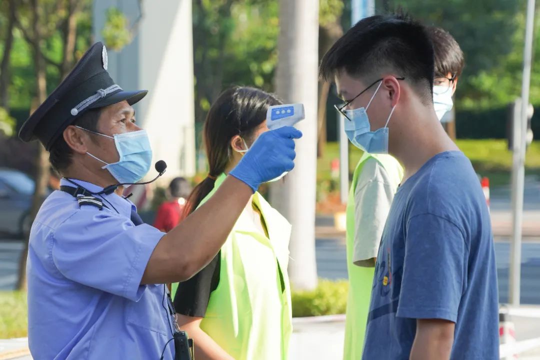 考生在校门口依次间隔1米排队进入考点,考点工作人员对考生查验“粤康码”、“通信大数据行程卡”、《健康情况声明书》、考前72小时内核酸检测结果阴性证明、准考证、有效居民身份证原件并测量体温。