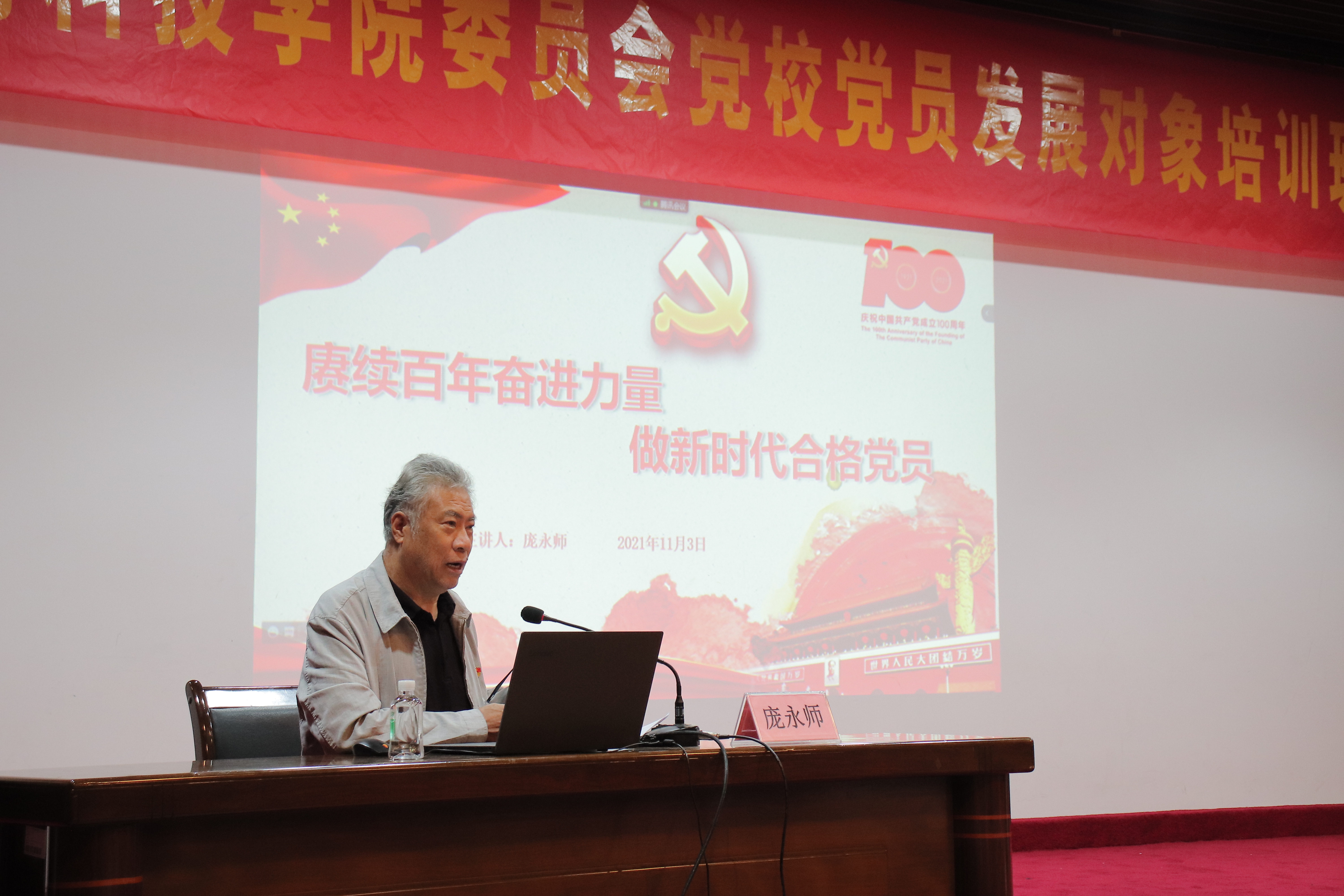 11月3日晚,庞永师执行校长以《赓续百年奋进力量,做新时代合格党员》为题开讲第一堂党史学习教育课。庞校长简要回顾了中国共产党百年建党历史,提出党员要践行党为人民谋幸福的初心和为中华民族谋复兴的使命,教导党员发展对象要有中国共产党党员的自我革命精神,不断自我锤炼和锻造,增强创造活力,使党的事业蓬勃发展。他强调中国共产党党员要扎根群众,以人民群众对美好生活的向往作为目标,为增加实实在在获得感、幸福感、安全感而奋斗。