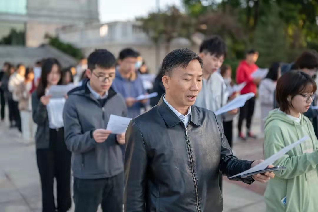 ▲校长助理欧仕身带领广州校区师生代表参加“宪法晨读”活动。