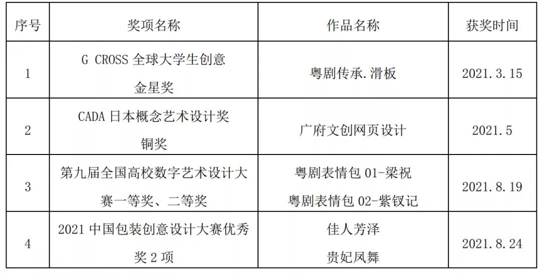 同时,该课程案例“以赛促建”,根植地方非遗元素,结合设计专业特色,把课程中积累的粤剧IP形象,通过参加各类设计比赛的进行二次创作,仅2021年就获得了国内外各大设计比赛奖项6项。另外,阮艺老师带领学生团队开展“非遗科研项目”的理论研究,带领学生团队对粤剧文创设计成果进行科研申报,校级科研项目成功立项2项,对外发表论文1篇,提高了在校学生对“非遗”文化的理论研究水平。