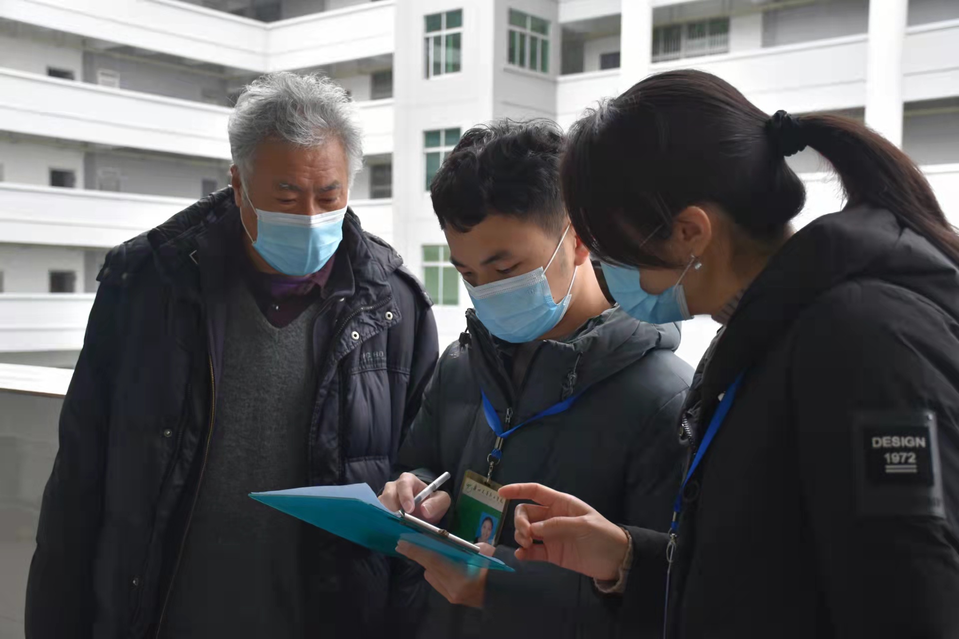 ▲ 学校董事长、校长刘剑锋(前左一)、常务副校长吴舸、副校长刘志新带队在肇庆校区检查开学第一天上课情况。