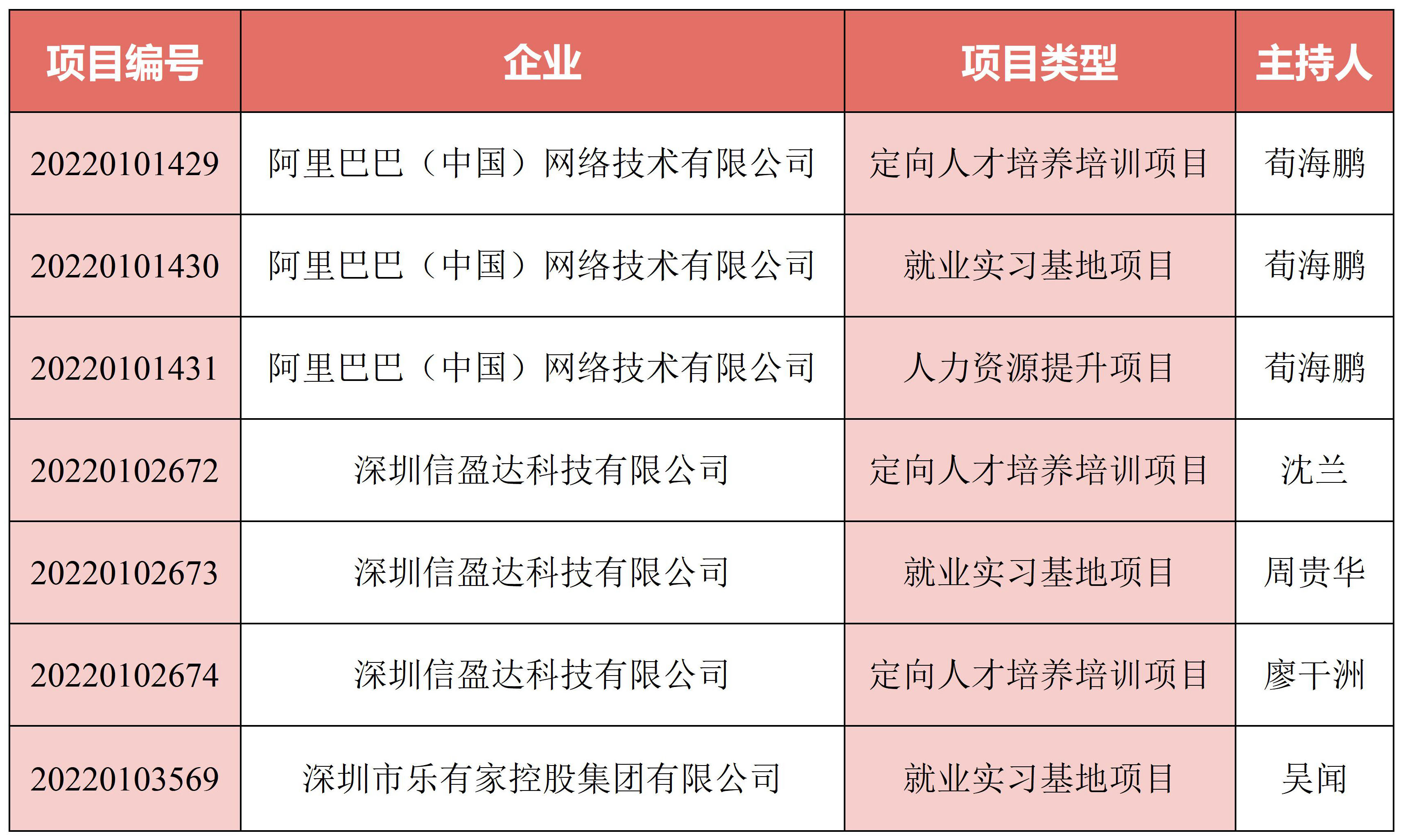 近日,教育部印发了《关于公布第一期供需对接就业育人项目立项名单的通知》(教学司函〔2022〕7号)。我校共有7个项目获批立项,用人单位包括阿里巴巴(中国)网络技术有限公司、深圳信盈达科技有限公司、深圳市乐有家控股集团有限公司,涵盖信息通信与互联网、商贸服务与生活消费等行业,项目类型为定向人才培养培训项目、就业实习基地项目以及人力资源提升项目。