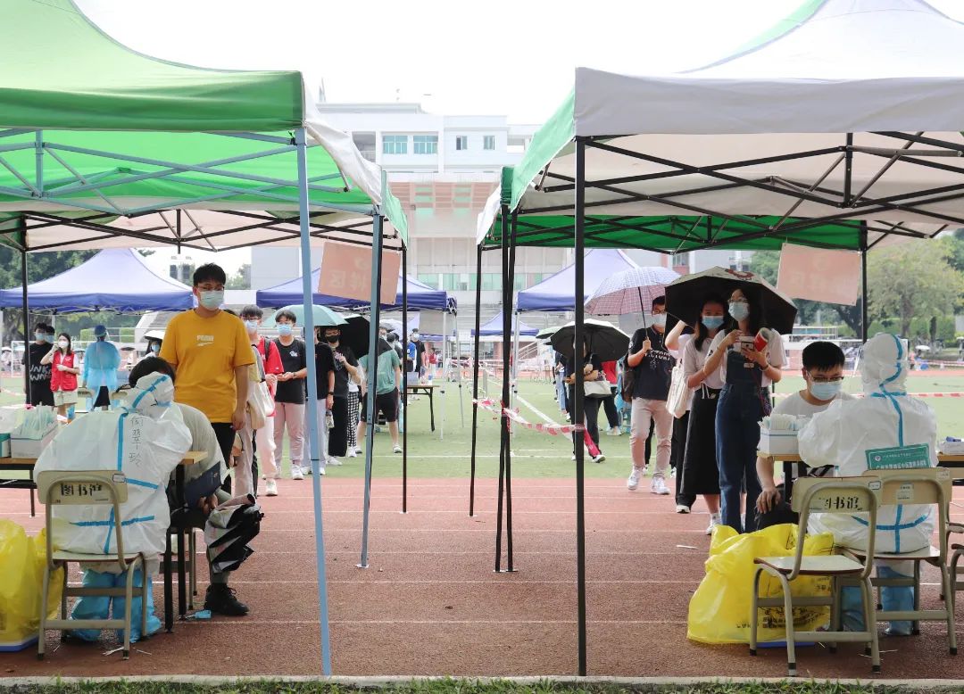 全校师生有序来到现场测温,进入扫码等候区和信息确认区,逐一进行核酸检测。现场分为三个测温区,十个登记区,十个采样区,区域分工明确,方便采样工作顺利开展。在核酸检测过程中,师生们时刻谨记佩戴口罩,严格遵守一米线,有序排队,不扎堆,不交谈,听从现场工作人员的安排。医护人员身穿白色防护服、用酒精消毒、拿棉签为师生取样,做到每一步从严、从紧、从细。为了核酸检测工作能顺利进行,学校安排了100名志愿者协助核酸检测工作,他们身穿红色马甲,佩戴口罩,在现场维持秩序,并且提前收集师生的采样信息,协助医护人员尽快完成采样工作。