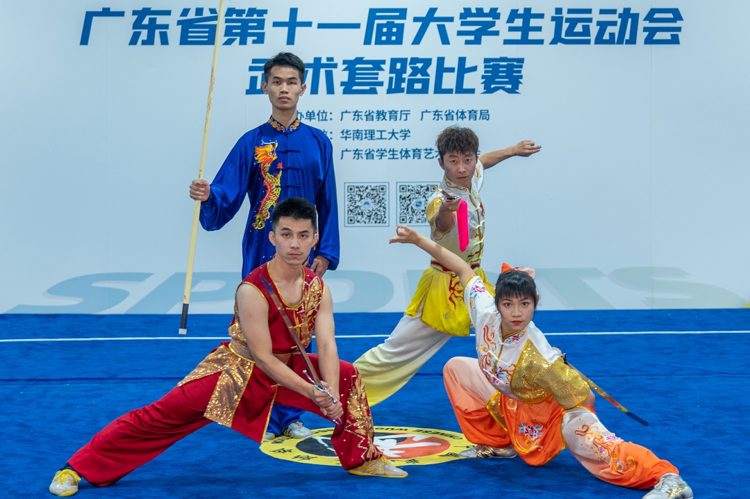 我校学生董婉琪、潘梓烨、纪建志和张超越等4人,2021年参加了广东省武术套路锦标赛,并且都在各自项目中以前八名的好成绩进入今年举行的广东省第十一届大学生运动会决赛。我校武术队在体育科技学院院长张军教授的指导下,由获得过第八届世界传统武术锦标赛亚军的文青云老师担任主教练负责训练。根据本届省大运会武术项目的参赛资格,董婉琪同学参加自选枪术与自选剑术;潘梓烨同学参加自选太极拳与自选剑术;纪建志同学参加自选枪术与自选剑术;张超越同学参加自选棍术与自选南刀,合计七个项目。