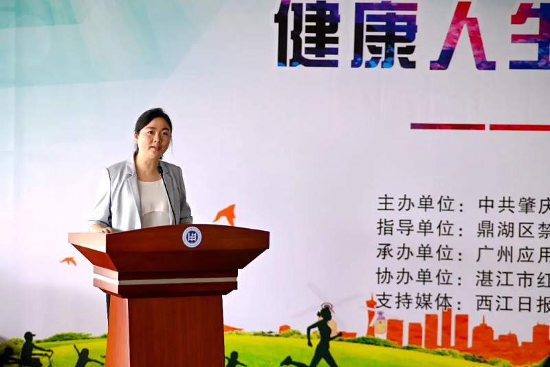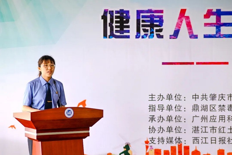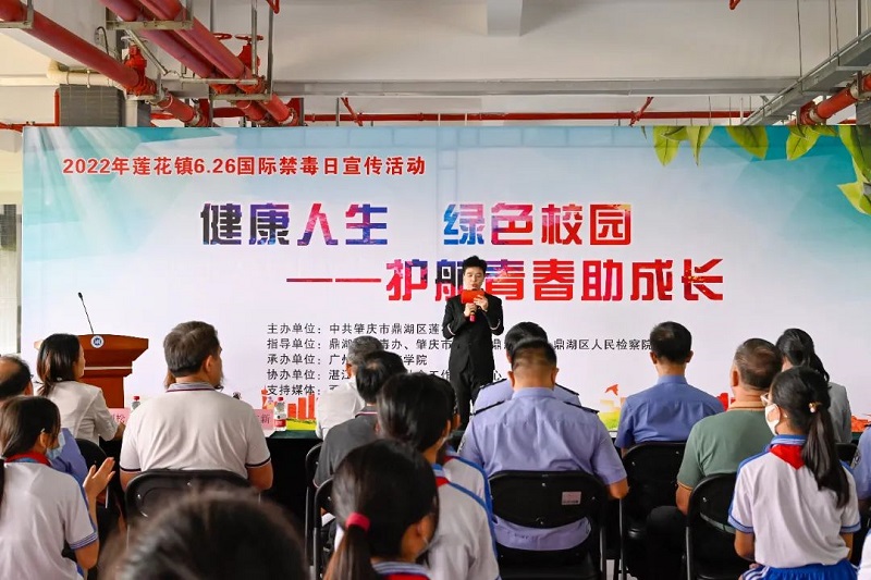鼎湖区人民检察院派驻莲花检察室主任冯艺在活动中进行《美丽人生不“毒”行》主题禁毒宣讲。