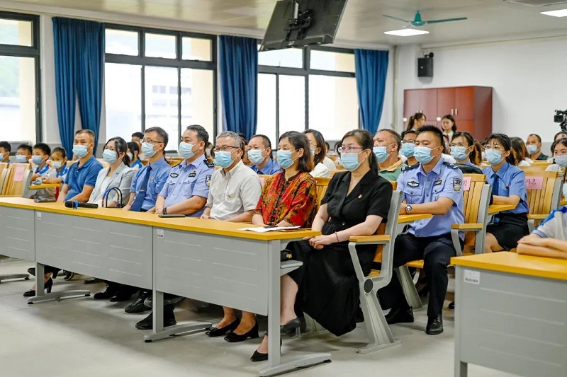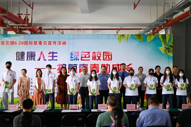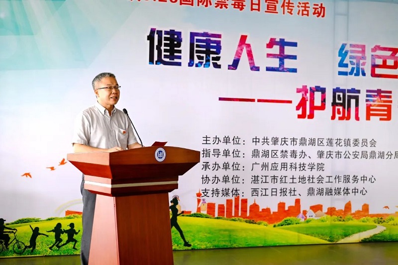 在第35个国际禁毒日到来之际,6月21日上午,以“健康人生 绿色校园——健康人生护成长”为主题的2022年肇庆市莲花镇“6·26”国际禁毒日宣传活动在我校肇庆校区举行。肇庆市鼎湖区副区长、公安局局长高成,鼎湖区人民检察院检察长唐祝亮,鼎湖区委政法委常务副书记梁杰成,鼎湖区人民检察院副检察长李宏,鼎湖区禁毒大队中队长陈肇勇,鼎湖区人民检察院检察官刘娜、伍亮、冯艺,鼎湖区人民法院审判委员会专职委员、四级高级法官谭活枝,莲花镇党委书记陈振玉,莲花镇党委副书记、派出所长陈汉初,莲花镇党委委员、组织委员李日佳,莲花镇党委委员、宣传委员刘继优,莲花镇副镇长苏志祥,我校党委书记王永云,副校长刘志新、李荆松,我校法政学院院长梁玉霞教授等领导出席活动。鼎湖区人民检察院、人民法院、禁毒大队、我校相关领导以及莲花镇真光小学学生代表、初级中学学生代表、我校法政学院学生代表参加了本次活动。
