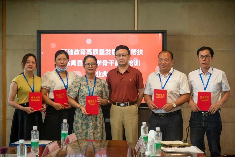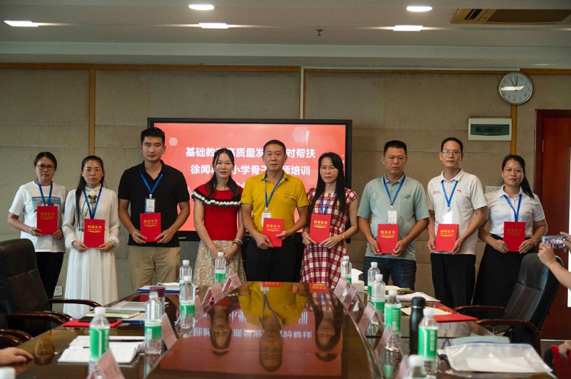为贯彻落实省委、省政府关于推动基础教育高质量发展的工作要求,做好全口径全方位融入式帮扶粤东粤西粤北地区基础教育高质量发展工作,7月18日—21日,基础教育高质量发展结对帮扶——徐闻县中小学骨干教师培训在我校举行。来自湛江徐闻县下桥镇中心小学、西连镇瓜藤小学、西连镇石马小学、西连镇乐琴小学、西连镇龙腋小学、城北乡中心小学、角尾乡中心小学等学校的校长和教师代表参加了培训。我校副校长李江凌、校长助理欧仕身代表学校主持此次帮扶培训。
