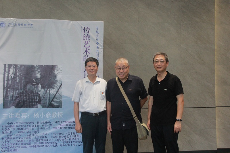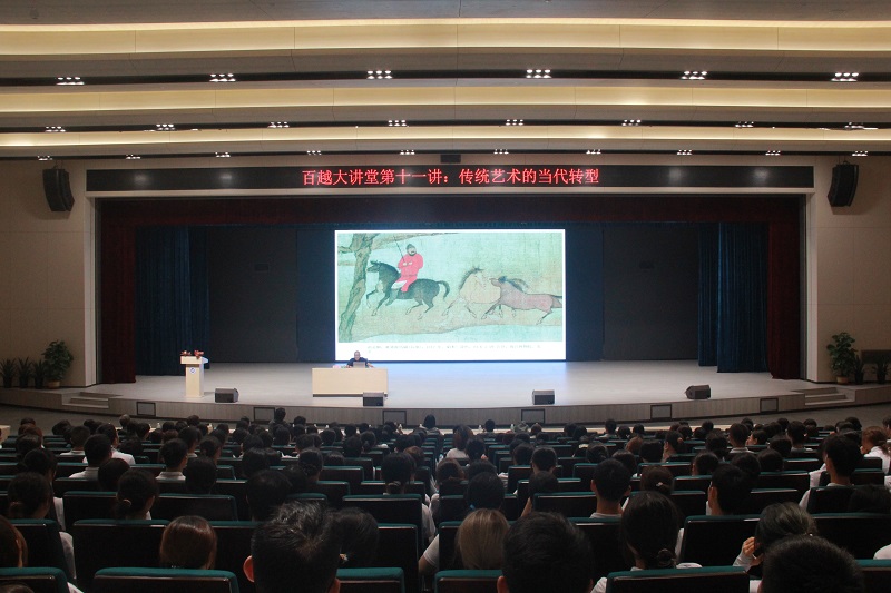 9月9日上午,“百越大讲堂”第十一讲在图书馆3楼小礼堂开讲。中山大学艺术学院教授、博士生导师杨小彦应邀作《传统艺术的当代转型》专题讲座。校领导,美术创意学院师生代表近800余人到场聆听讲座。讲座由两名学生用中、英双语主持,美术创意学院院长贺锋林教授学术主持。
