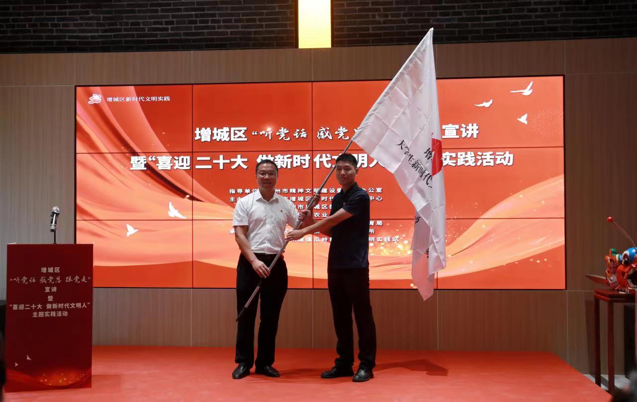 当天活动,“1+7+N”增城校地宣传思政联盟新塘镇大学生新时代文明实践志愿服务队正式成立。新塘镇党委副书记黄志刚代表增城新塘正式向我校授旗,我校团委书记郭振代表广应科接旗。新塘镇将努力搭建好志愿服务平台,推动校地宣传思政联盟共建工作持续深入开展,引导青年学生争做新时代文明人,支持我校大学生持续走进新塘,开展乡村振兴志愿服务工作。