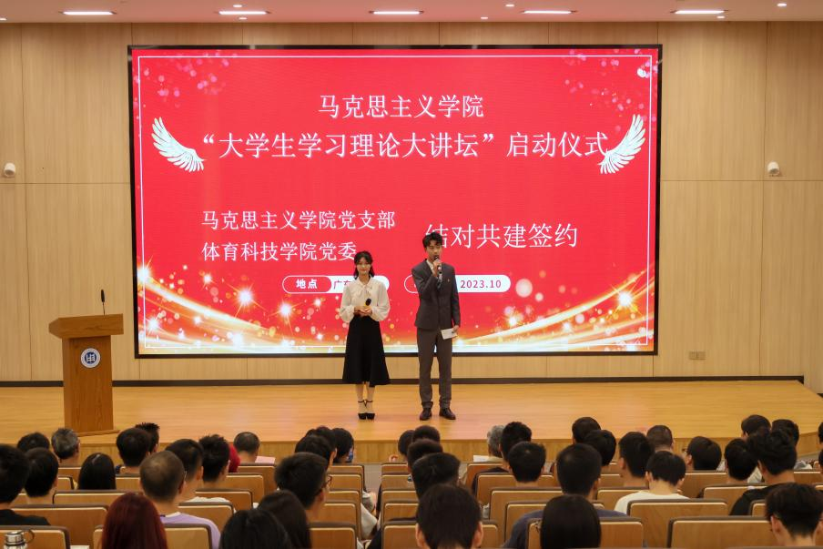 10月23日晚,我校马克思主义学院“大学生学习理论宣讲坛”启动仪式和马克思主义学院党支部、体育科技学院党委共建签约在图书馆一楼报告厅举行。学校党委书记王永云、党委宣传部部长李帆、马克思主义学院院长李江凌、马克思主义学院党支部书记王天佐、体育科技学院党委书记郝淑新以及师生代表参加此次仪式。