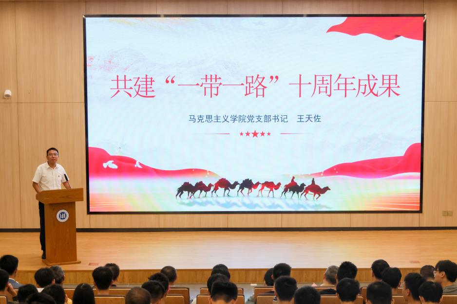 随后,马克思主义学院党支部书记王天佐为首期“大学生学习理论宣讲坛”作共建“一带一路”十周年成果主题宣讲。