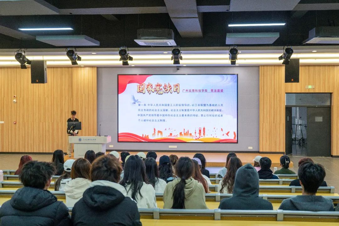 12月4日,广州应用科技学院党建馆内一片暖意融融。连通教育部“国家宪法日”宪法晨读活动主会场的直播视频信号,广应科分会场在场师生齐声同步诵读宪法部分条文,语句铿锵有力,神情庄重肃穆。为深入学习贯彻习近平新时代中国特色社会主义思想,落实“八五”普法规划要求,弘扬宪法精神,增强宪法自觉,推动宪法精神深入人心,在第10个国家宪法日到来之际,学校举办“宪法宣传周”活动,深入学习宣传习近平法治思想,弘扬宪法精神,致力于讲好法治中国的宪法故事。