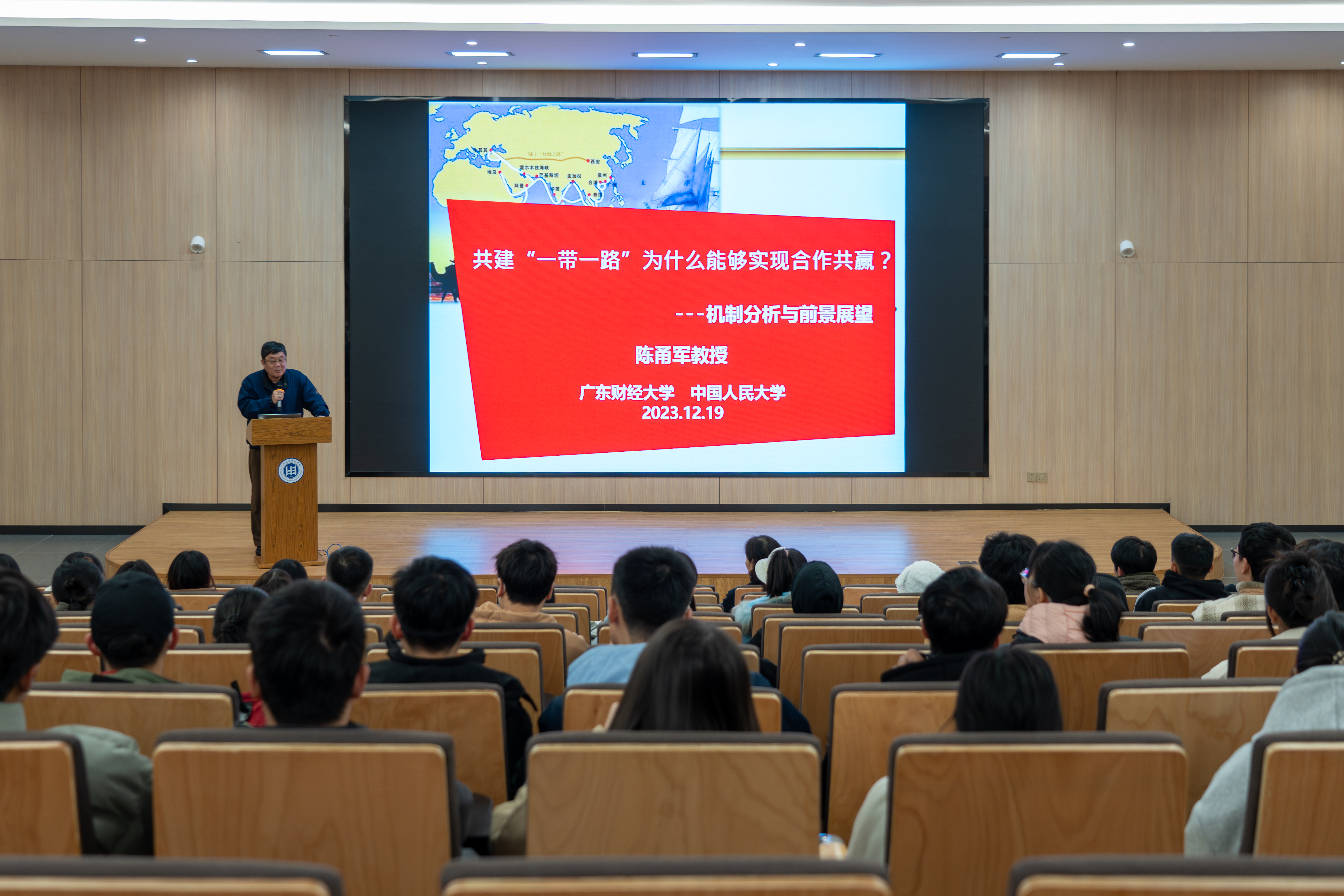 12月19日下午,国务院政府特殊津贴专家、大湾区双循环发展研究院院长、中国人民大学商学院博士生导师陈甬军教授应邀莅临“百越大讲堂”,在图书馆一楼报告厅为我校师生作《共建“一带一路”为什么能够实现合作共赢》主题讲座。学校副校长刘志新教授,校团委书记郭振及300余名师生聆听讲座。讲座由刘志新副校长主持。