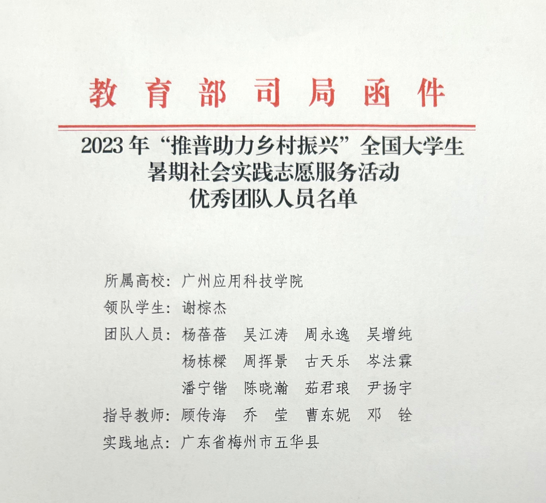 近日,教育部、共青团中央向我校发来表扬信,对广州应用科技学院参与教育部2023年“推普助力乡村振兴”全国大学生暑期社会实践志愿服务活动并表现突出的“融媒体”推普实践队予以表扬。该团队深入广东省梅州市五华县,走访当地群众了解其普通话情况,并且以棉洋中学为点,开展推广普通话课程。