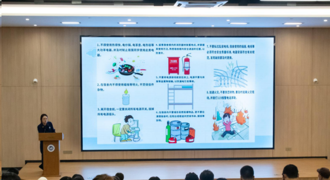 鼎湖区消防救援大队陈警官从消防安全制度解读、为何火灾事故频发、遇到火灾事故如何处理三个方面,通过现场互动、图文结合等方式,向师生反复强调防范火灾隐患的重要性。会上,陈警官还结合河南省南阳市一学校宿舍发生火灾一例,深入剖析了校园发生火灾原因及安全用电防火注意事项,并针对校园火灾特点传授了火场逃生小技巧和灭火器使用“四字法”。