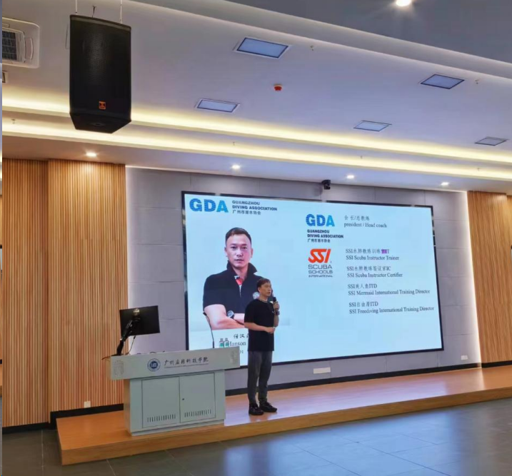 广州市潜水协会副会长任立才,以自身与潜水的深厚渊源为切入点,向在座的师生们分享了自己对潜水的独到见解,科普了在水下环境中如何保持平衡、如何与海洋生物和谐共处等相关知识。接着,任副会长利用精心准备的图片及视频资料向同学们展示了全球范围内知名的潜水景点。任副会长强调,海洋是我们共同的宝贵家园,我们在享受潜水带来的愉悦之时,更应致力于保护我们赖以生存的地球。