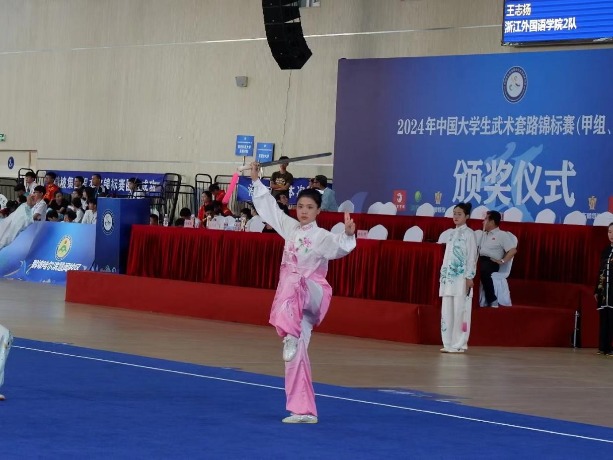 6月8日,2024年中国大学生武术套路锦标赛(甲组、乙组)在哈尔滨华德学院体育馆圆满落幕。我校武术队由体育科技学院院长张军担任领队,文青云和王蕊芯两位老师担任教练共5名运动员代表学校出征赛事,经过5天的激烈角逐,最终斩获1金2银1铜的佳绩。同时文青云老师获得优秀教练员称号,蒙卓彬同学获得优秀运动员称号。