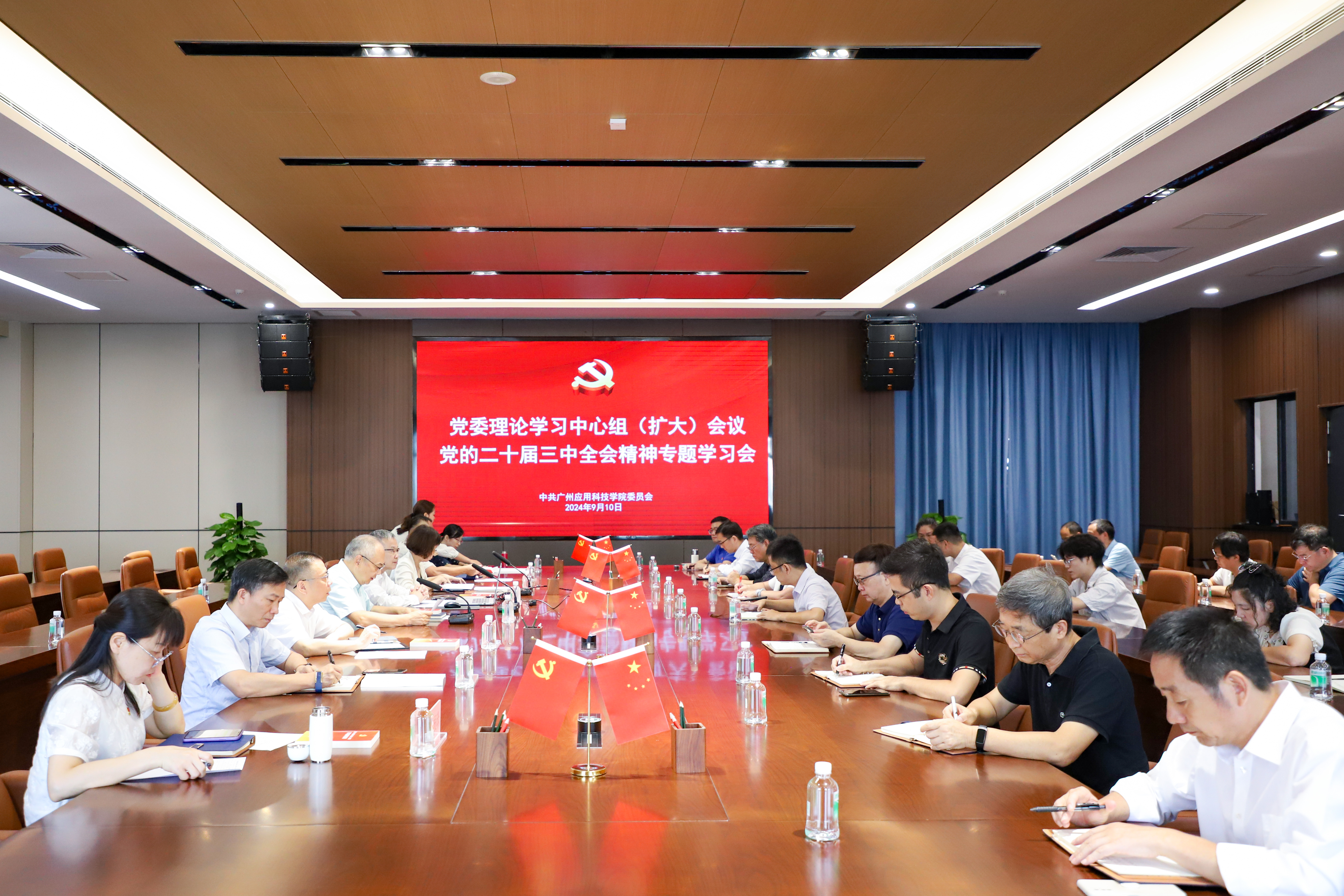 2024年9月10日上午,我校在肇庆校区行政中心五楼国际会议厅,召开党委理论学习中心组(扩大)会议,专题学习贯彻党的二十届三中全会精神,推进学校教育事业高质量发展。学校党员校领导、党委委员、纪委委员、党员中层正职(主持工作负责人)、二级学院党委书记(副书记)及直属党支部书记参加会议。会议由执行校长张光宇主持。