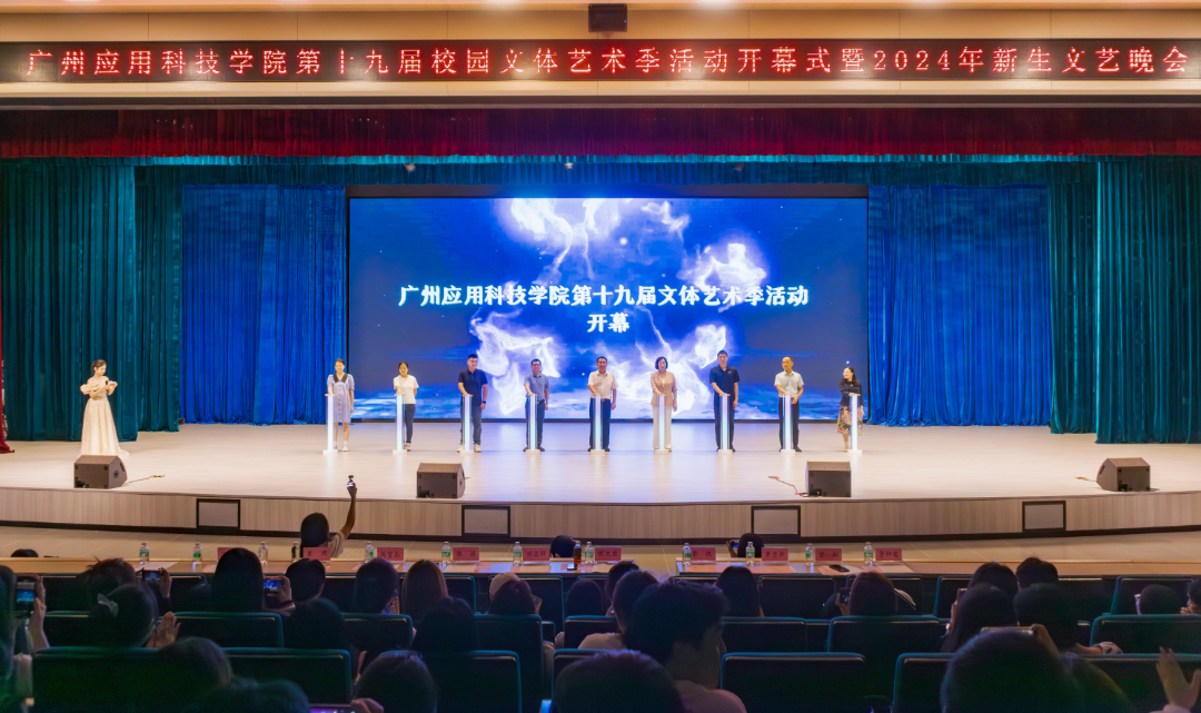 党委书记陈光团,副校长刘志新,党委宣传部部长李帆,校团委书记郭振,校团委副书记万烨萍,计算机学院党委书记周育山,文学与传媒学院党委副书记李妙芝,外国语学院党委副书记吴闻,音乐学院副院长罗月云等9位领导同时按下启动仪式灯柱,标志着我校第十九届文体艺术季活动正式开幕!