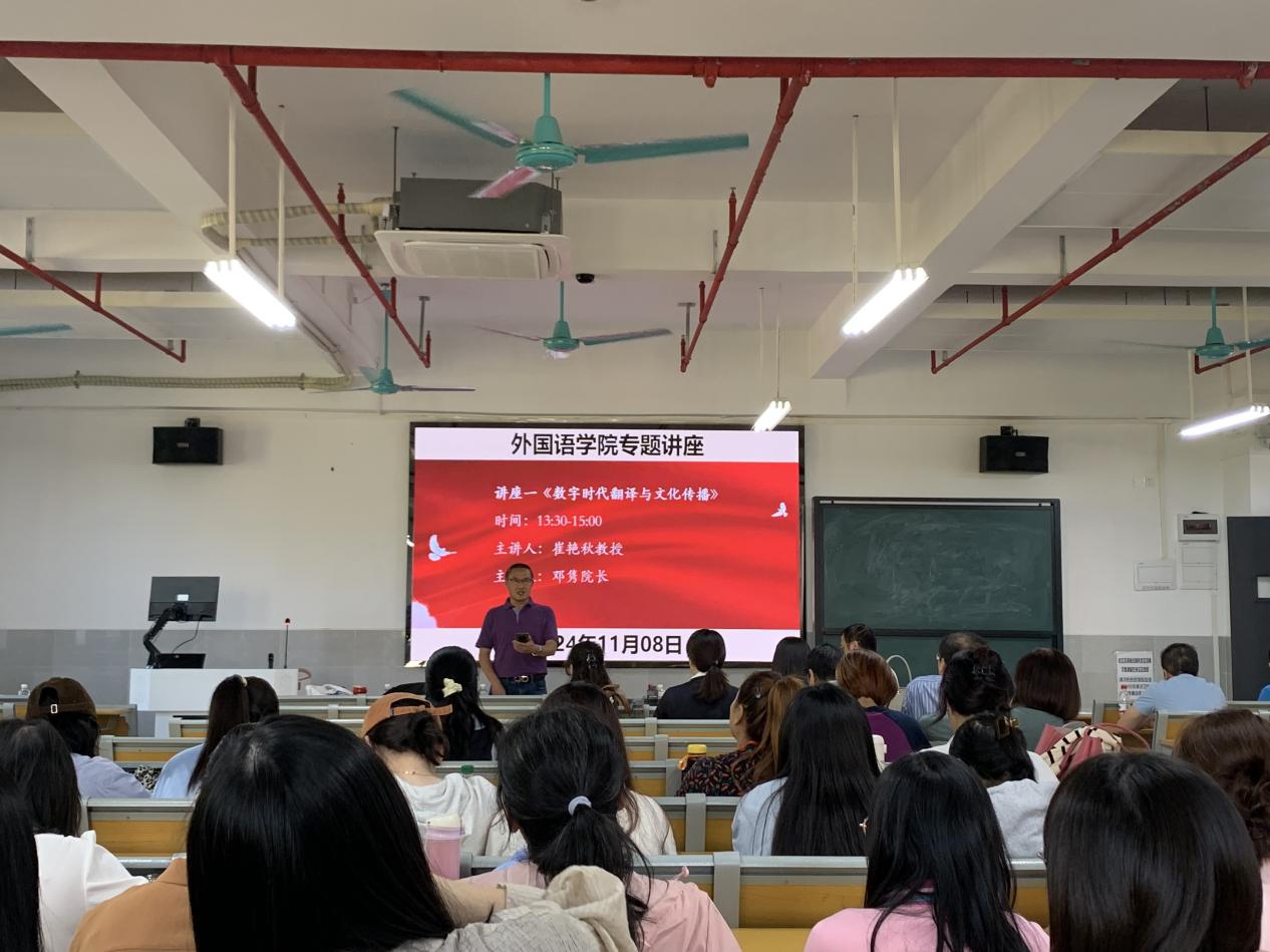 2024年11月8日下午13:30,我院特邀电子科技大学中山学院崔艳秋教授(博士)和李天刚副教授,在明德楼J2-301举办了“数字时代翻译与文化传播”和“校本大学英语课程体系建设及ESP课程开发与教学实践”两场专题讲座。讲座由邓隽院长主持,全体专任教师参加讲座。