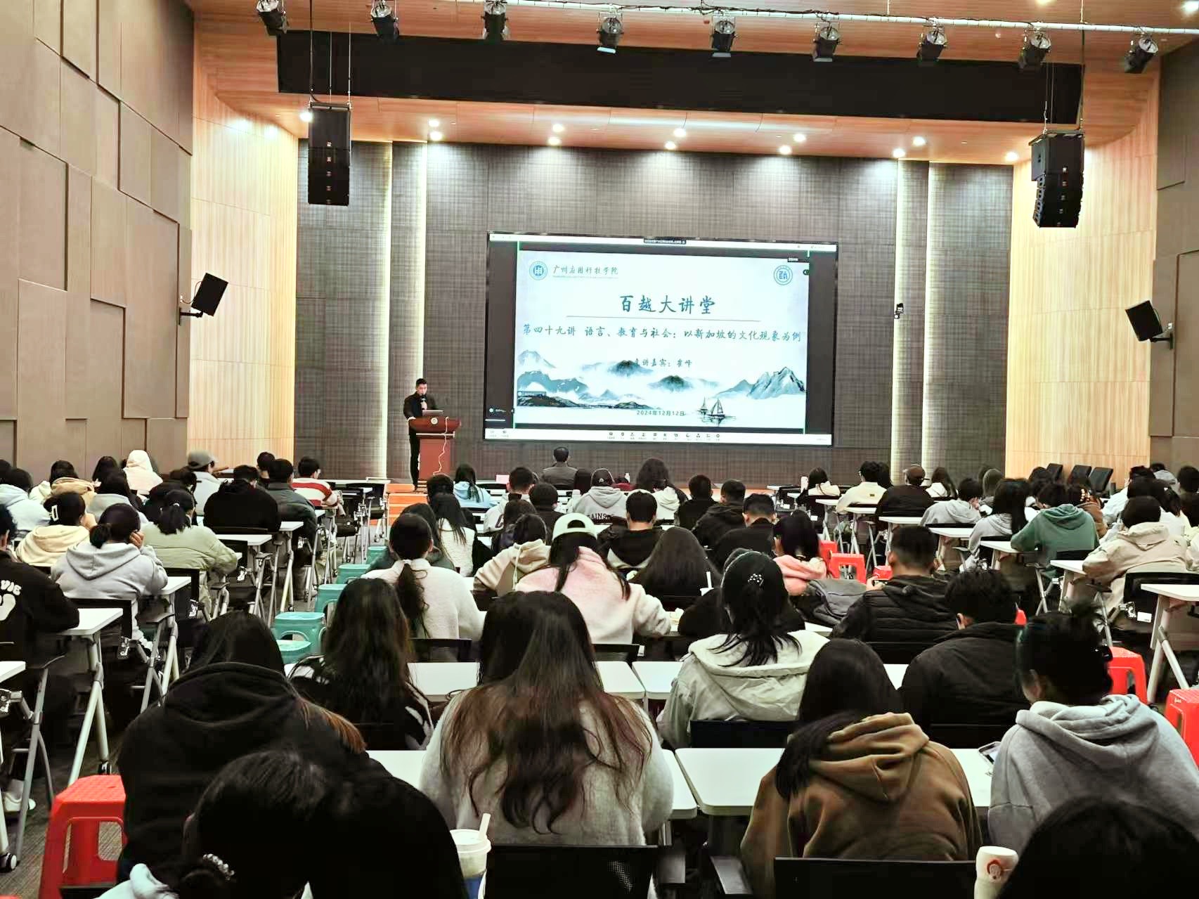 12月12日下午,“百越大讲堂”第四十九讲在行政中心一楼报告厅举行,新加坡南洋理工大学博士生导师崔峰教授应邀为我校师生作《语言、教育与社会——以新加坡的多元文化现象为例》专题讲座。校团委书记郭振及200余名师生参与讲座,讲座由郭振主持。