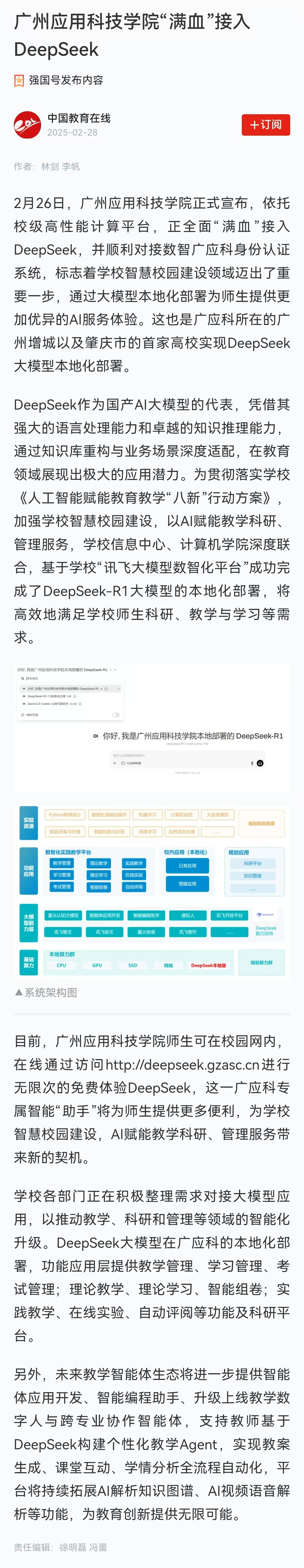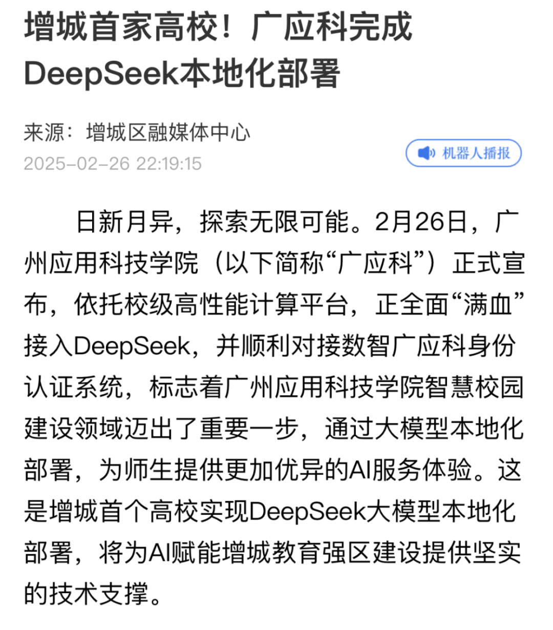 不是单纯所谓的“接入” 而是“满血”本地化部署DeepSeeK 需要强大的算力和硬件配置投入 作为一所民办本科高校 广应科,何以 与众多公办重点本科高校一样 在DeepSeeK横空出世之时 完成这一动作?