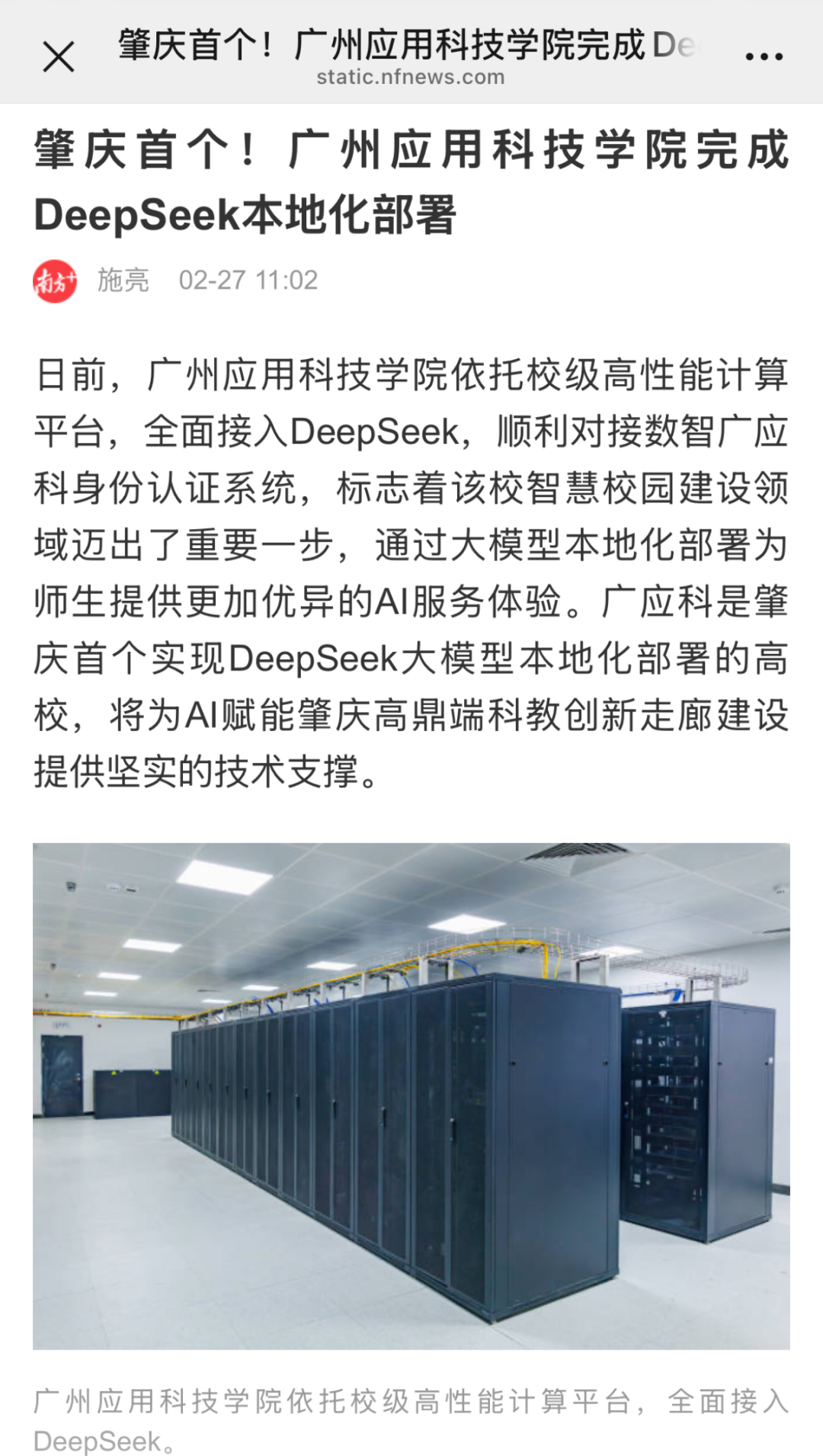 新年新学期第一周,广应科便强势“开局”!2月26日晚,广州应用科技学院对外宣布,学校依托校级高性能计算平台,完成DeepSeeK的本地化部署,在广应科两校区所在的广州、肇庆两城迅速“出圈”!