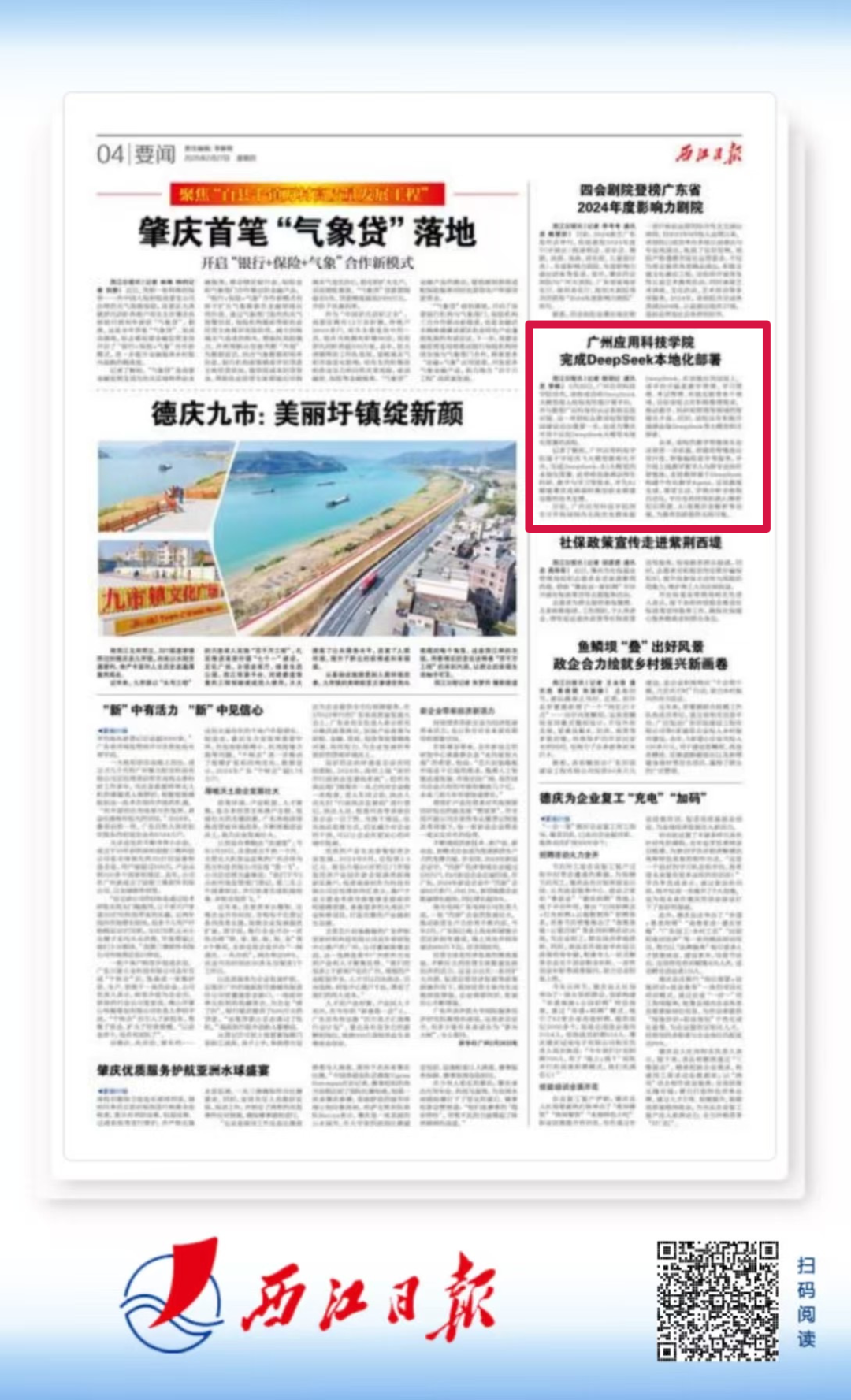学习强国、中国教育在线、南方+、南方都市报、西江日报等国家、省、市主流媒体,以及广州增城、肇庆新区、肇庆鼎湖区等学校所在地官方发布平台纷纷报道,“广州首家民办高校”“肇庆首家高校”“广州增城首家高校”本地化部署DeepSeeK。