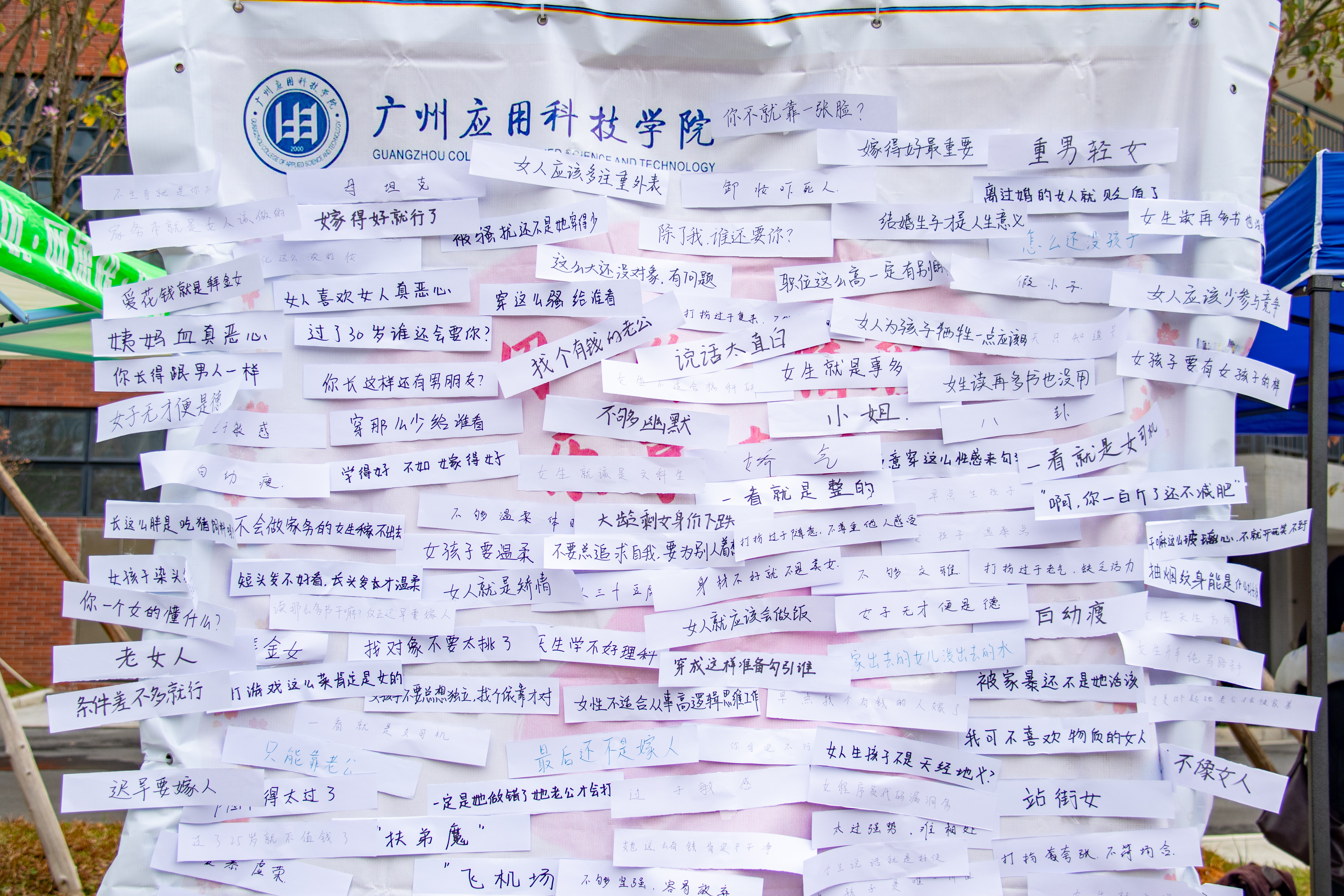 在H座旁的篮球场一隅,“女生标签墙”上张贴着一系列如“白幼瘦”“矫情”等反映对女性刻板印象的标签。现场参与者们走上前将标签一一取下,当标签被揭下的那一刻,也是千万女性打碎冲破标签的瞬间。随后,在细密的春雨里她们拿起笔为彼此写下新的寄语与期许,希望所有女性都能勇敢地展现自我,成为不被传统定义的新时代女性。