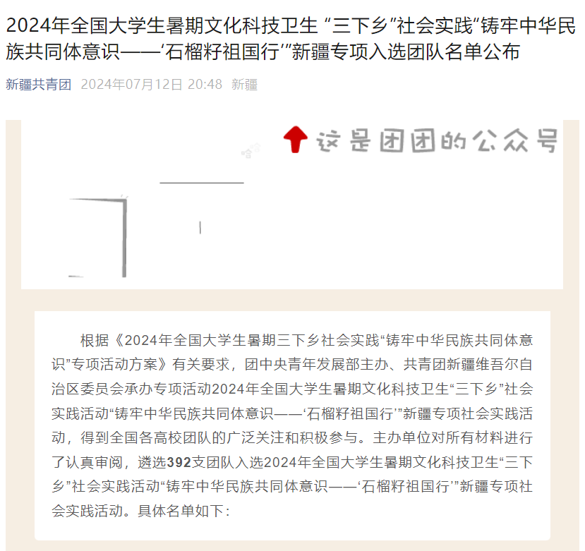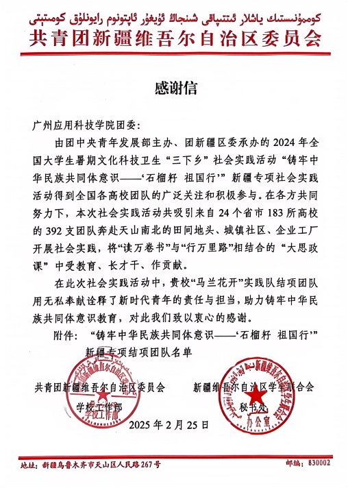 近日,共青团新疆维吾尔自治区委员会向我校团委发来了一封饱含深情的感谢信。信中,新疆自治区团委对我校“马兰花开”实践队在2024年全国大学生暑期“三下乡”社会实践活动——“铸牢中华民族共同体意识·‘石榴籽祖国行’新疆专项”中的卓越贡献给予了高度评价,并赞誉这一成果与学校所倡导的“第三课堂”社会实践理念高度契合,展现了新时代青年的责任与担当。