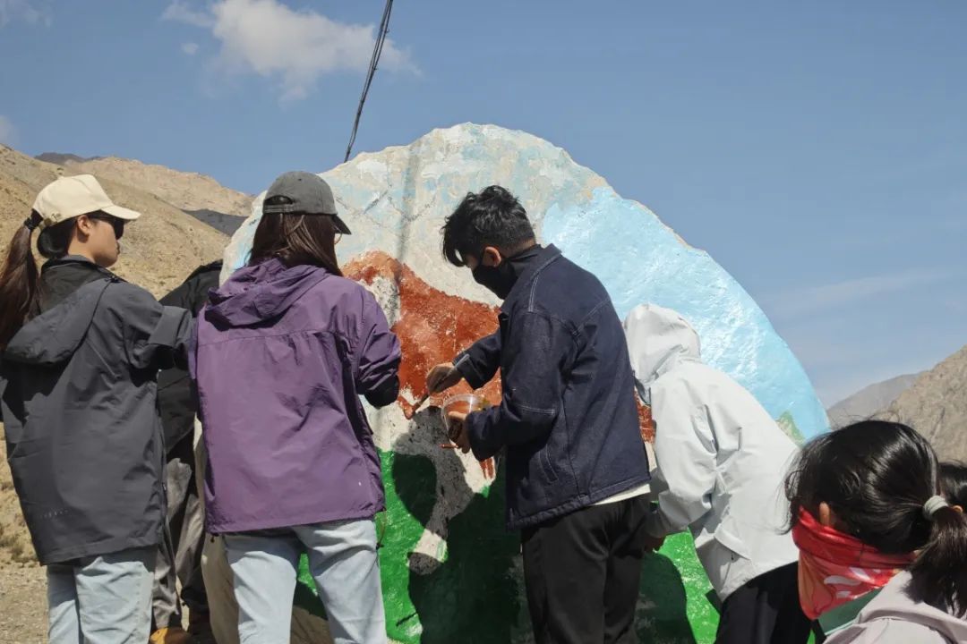 2024年夏天,在学校党政领导和校团委的全力支持下,美术创意学院党委经过深入研讨、精心策划与细致沟通,为实践队提供了全方位的保障。在张红亚、邓铨、顾传海、乔莹等老师的悉心指导下,“马兰花开”实践队以文建朝为领队,奔赴新疆维吾尔自治区克孜勒苏柯尔克孜自治州阿合奇县库兰萨日克乡,开展了以“重走边防路,再温卫国情”为主题的“六个一”社会实践活动:与戍边员同升一面国旗、携手并肩重走一次戍边路、重温入党誓词开展一次党日活动、立足学科专长绘制一次界碑、同唱《歌唱祖国》录制一次祝福祖国视频、发挥专业特色书写一次中国石。用所学知识助力当地发展,扎实推进民族团结进步事业。这一系列活动不仅加深了队员们对边疆地区的了解与认识,更在促进各民族交流交往交融中,让中华民族共同体意识深入人心。