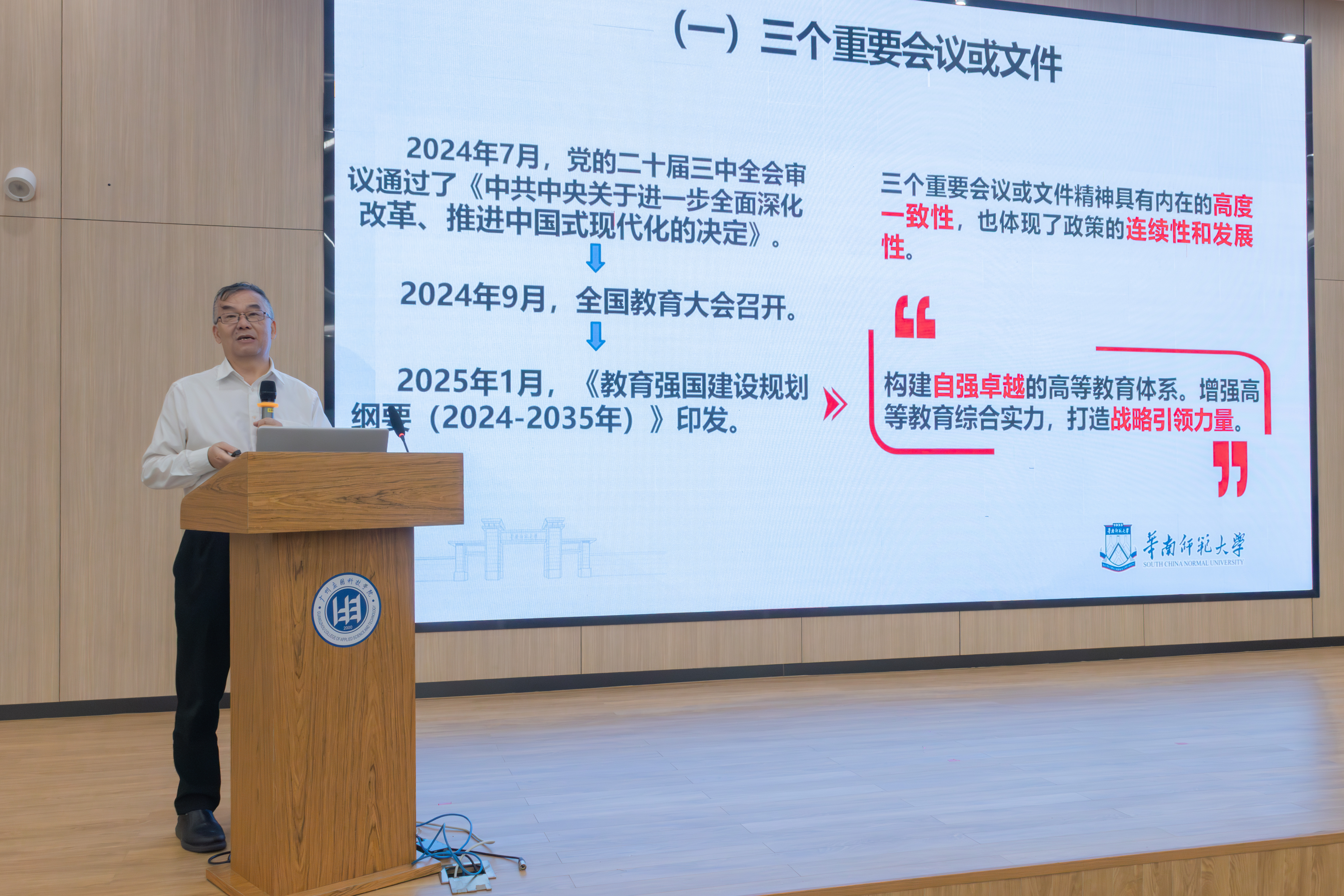 卢晓中院长以全国教育大会精神及《教育强国建设规划纲要(2024—2035年)》为指引,结合粤港澳大湾区教育发展实践,系统阐述了促进高校分类发展、优化高等教育布局的重要性,深入探讨了建立科技发展、国家战略需求为牵引的学科专业设置调整机制和人才培养模式的思路,讲解了高水平教育开放推动高等教育高质量发展以及以系统思维增强教育综合改革系统性整体性协同性的实施路径,对我校建设特色鲜明、优势突出的高水平应用型大学具有重要指导意义。