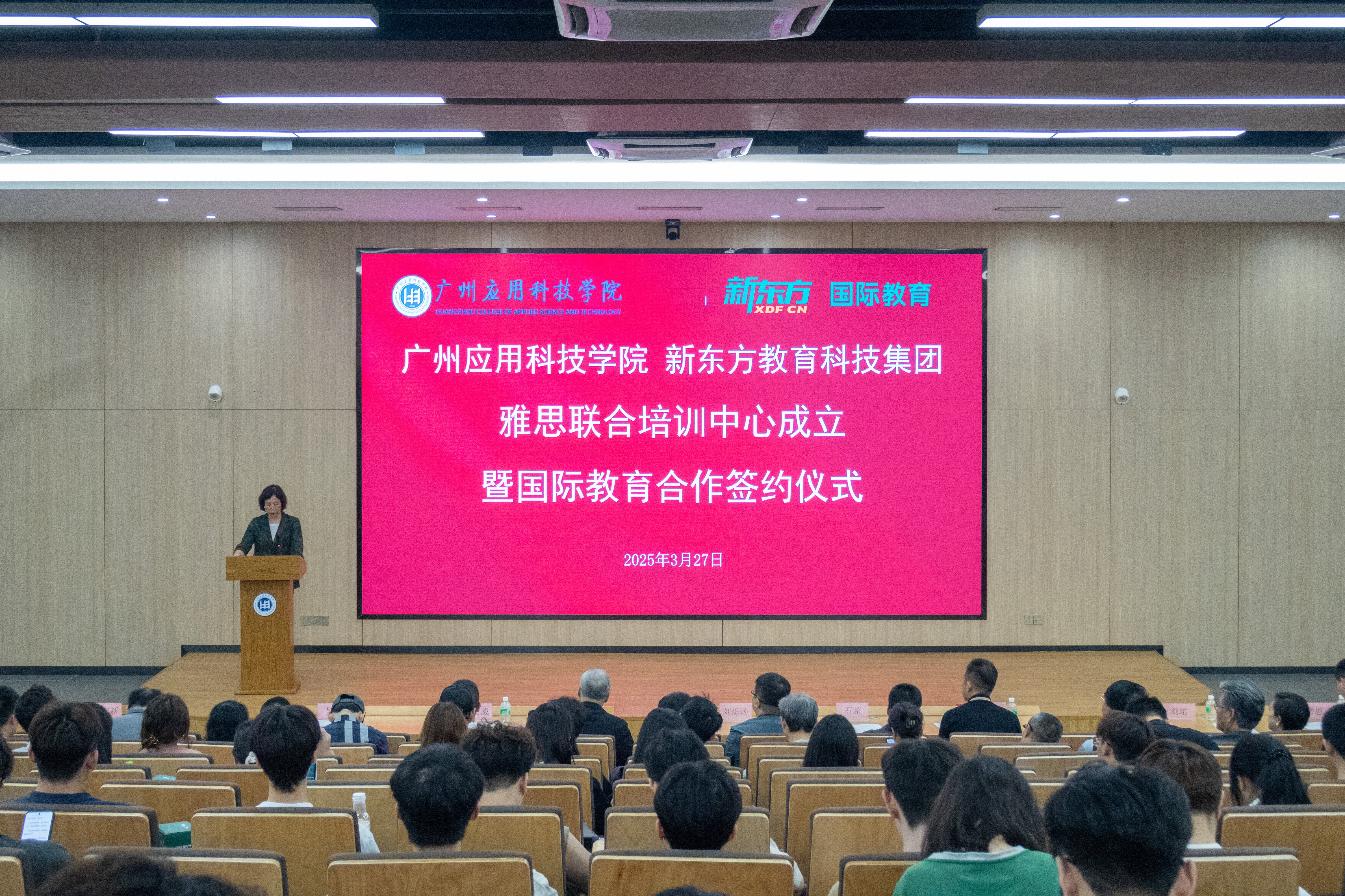 教育强国成于实干。3月27日,广州应用科技学院与新东方教育科技集团雅思联合培训中心成立暨国际教育战略合作签约仪式在图书馆一楼报告厅举行。此次合作旨在为广大在校学生及社会学习者提供专业化、系统化的雅思、托福及英语能力提升课程,助力学子拓展国际视野,增强升学与就业竞争力。我校校长张光宇、常务副校长吴舸、副校长刘志新,中国教育集团国际教育部总监吕文威,新东方教育科技集团副总裁兼国际教育培训事业部总裁刘烁炀、国际教育培训事业部渠道营销中心高级经理石超、国际教育广州中心总经理陈斌、国际教育广州中心总经理助理刘珺、国际教育广州中心市场经理曾思灵、国际教育广州中心外地市场主管梁杰文,以及我校教务处、学生处、团委负责人、各二级学院院长共同参加此次签约仪式。签约仪式由刘志新副校长主持。