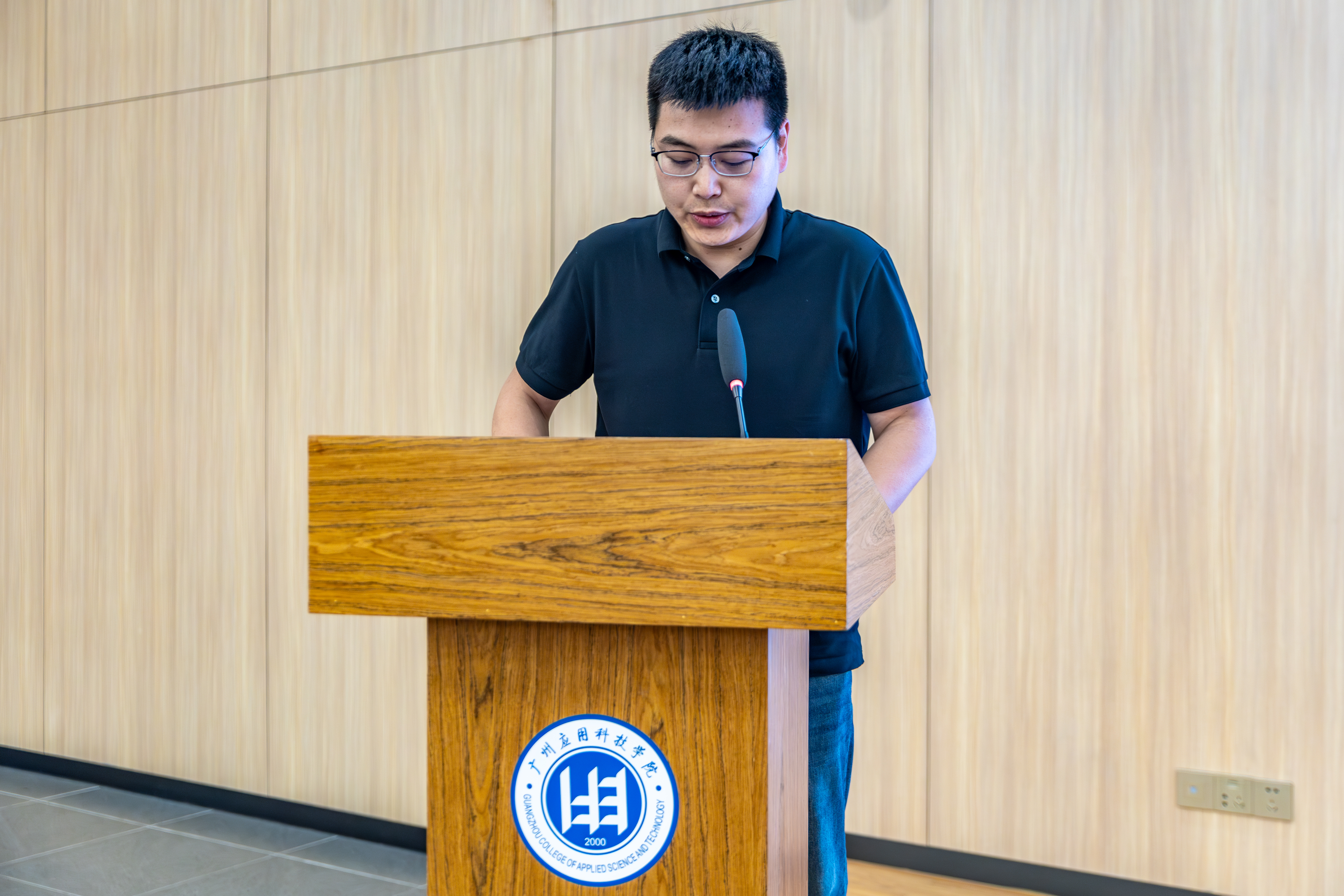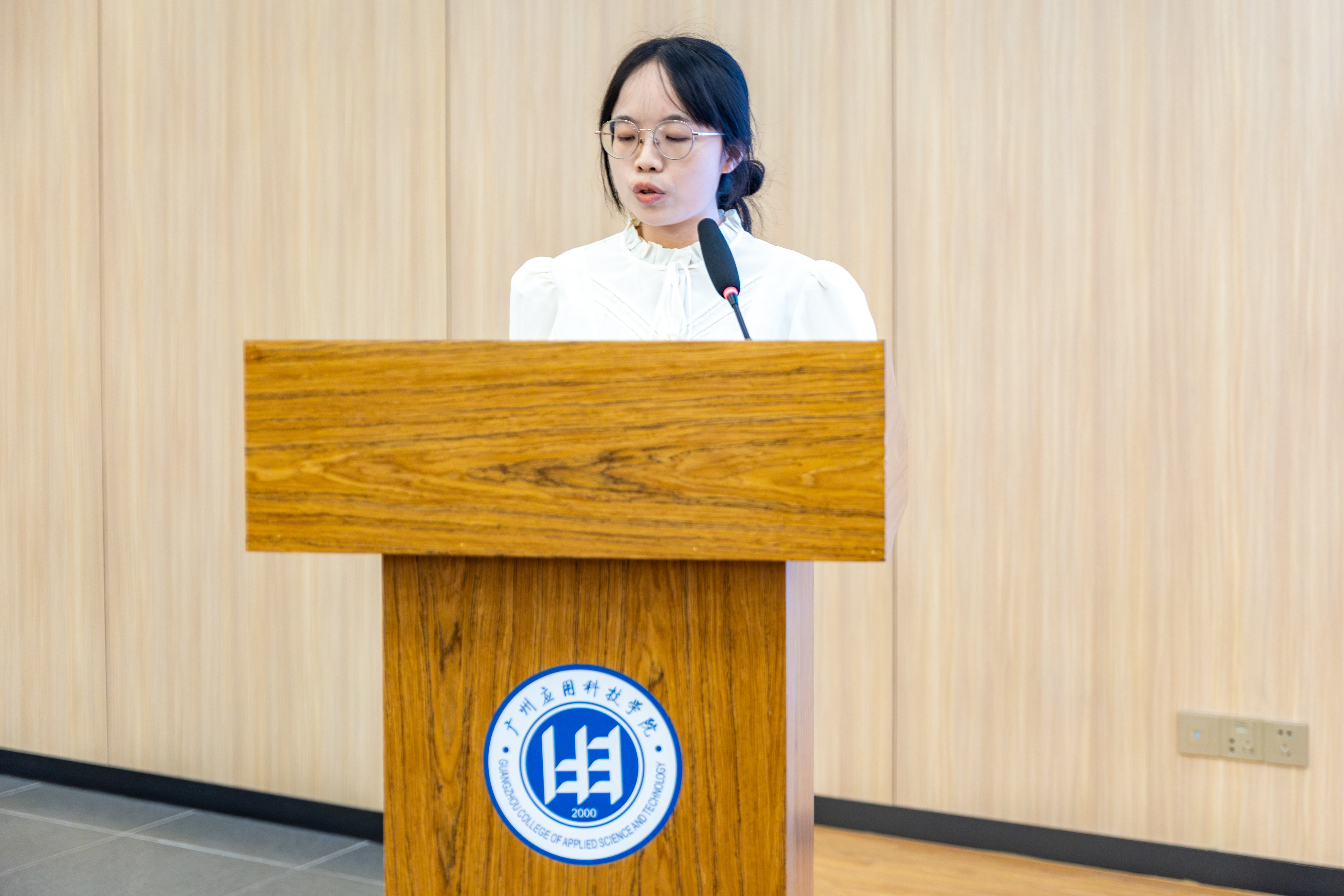 党委武装部干事宋美雪宣读广州应用科技学院第二届国旗护卫队成员名单。每一个代表广应科出征的名字,都象征着守护国旗的责任与使命的传递。