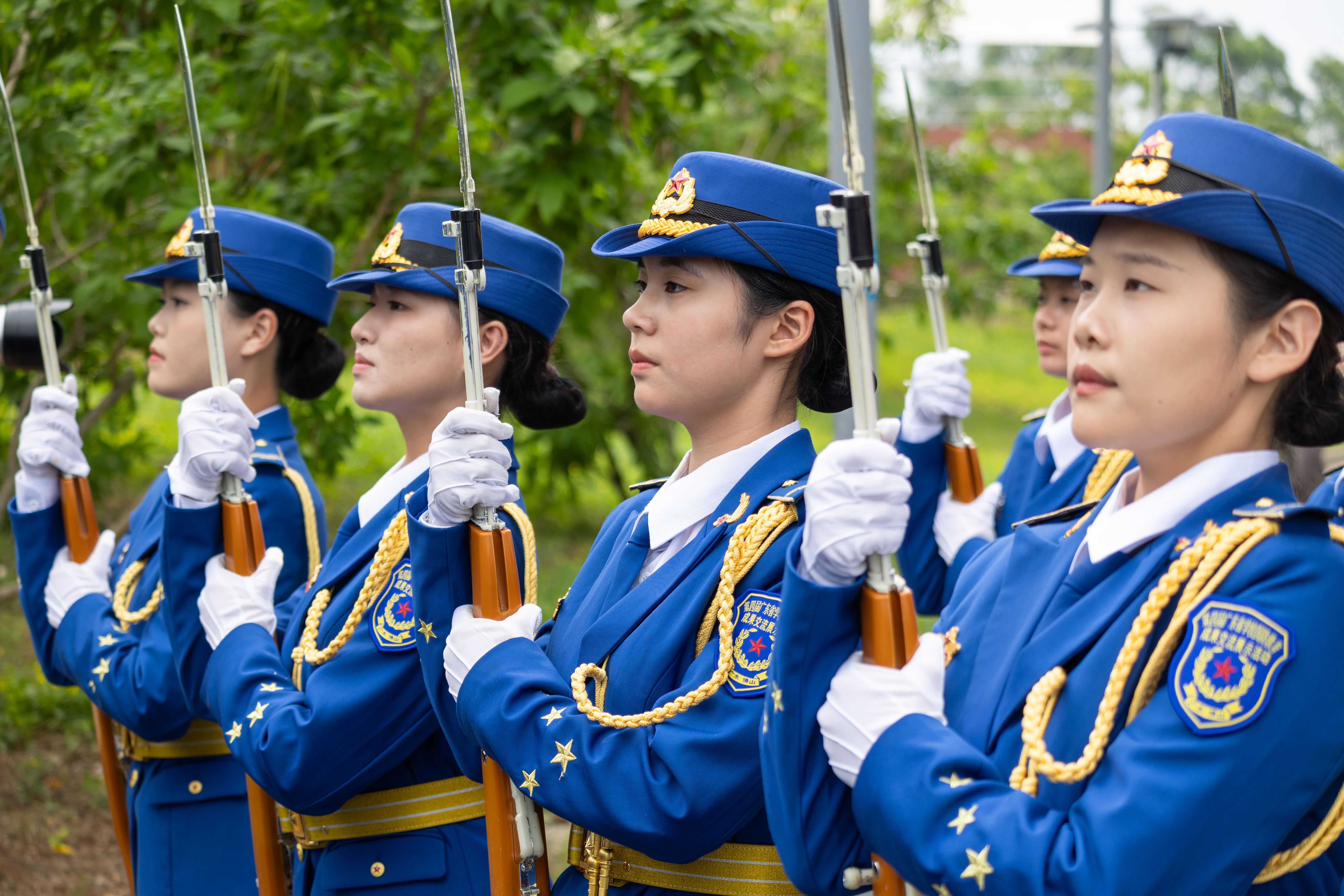 12时38分,比赛正式开始。28名队员们英姿焕发,身着蓝色礼服,戴着白手套,以挺拔的军姿彰显出广应科国旗护卫队的风采。队员们齐步入场,“注意!”“托枪!”口令声声入耳,动作迅疾有力。“齐步——走!”“正步——走!”随着指令切换,队员们齐刷刷踢出右腿,排面如刀切般平整,正步砸地声铿锵有力。随着铿锵口令,旗手林建鹏双臂瞬时发力,旗面迅速展开。“向国旗——敬礼!”话音刚落,林建鹏迅速抬手,五指并拢行注目礼。队员们整齐划一端起钢枪,枪杆紧贴身侧,以标准持枪礼向国旗致以最崇高的敬意。“礼毕!”当再次转为齐步走,队伍逐渐远离升旗台。75厘米的精准步幅,在每一次起落间敲出永恒节奏。