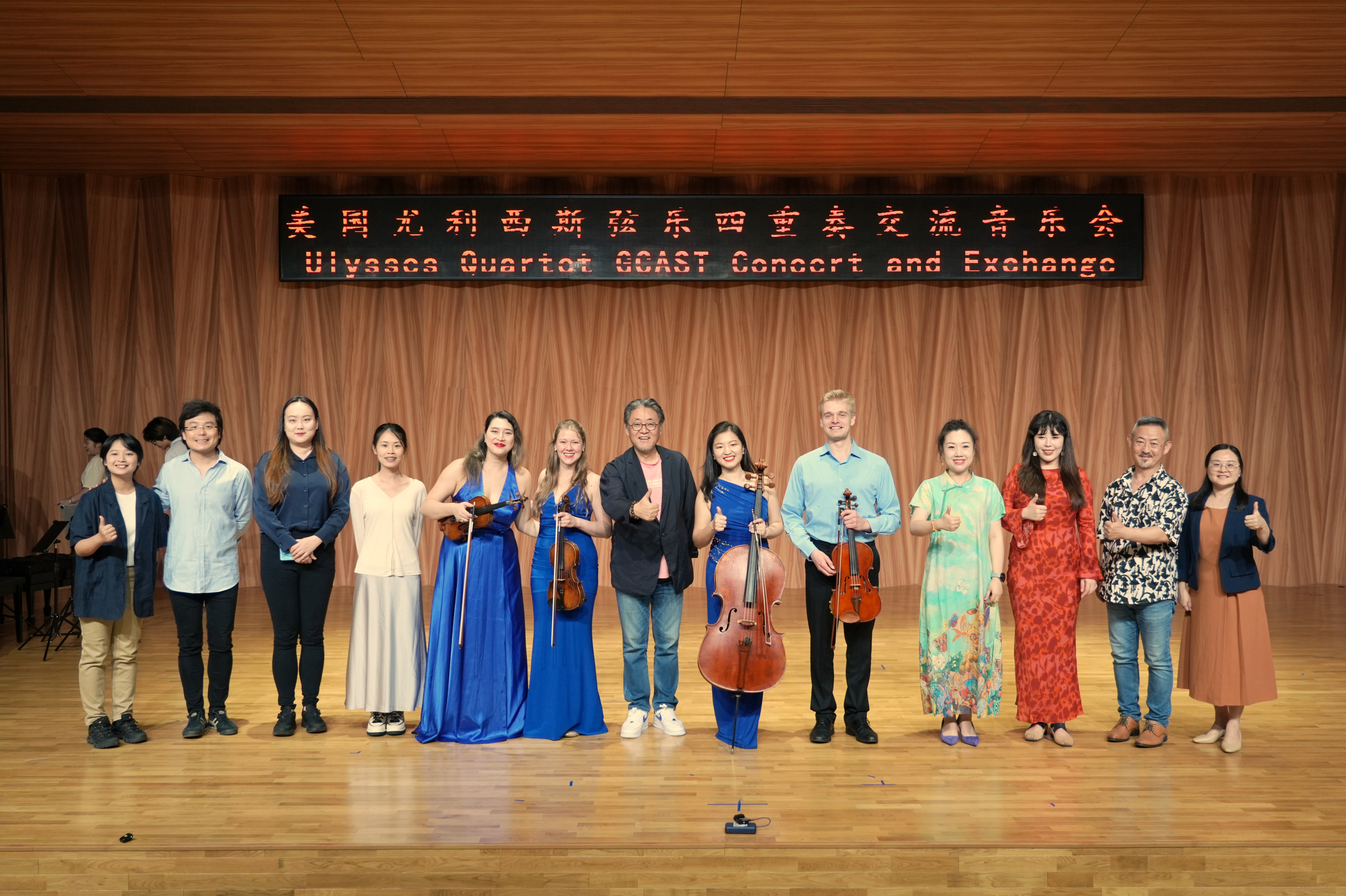 演出落幕,雷鸣般的掌声经久不息,这掌声是对精彩演出的肯定,更是对音乐交流融合的期待。同学们纷纷走上舞台,与演奏者们合影留念,在随后的签售会上,美国尤利西斯四重奏表演者热情地与同学们交流互动,让音乐之外的这份艺术共鸣,在彼此心间流淌。