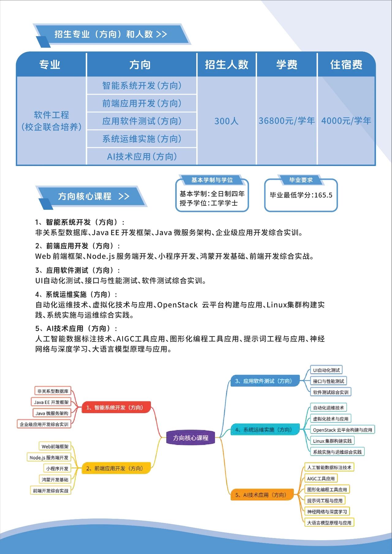 科大讯飞AI产业学院将于今年正式启动招生,首批将开设软件工程(校企联合培养)专业,下设智能系统开发、前端应用开发、应用软件测试、系统运维实施、AI技术应用五个方向,2025年计划招生300人。