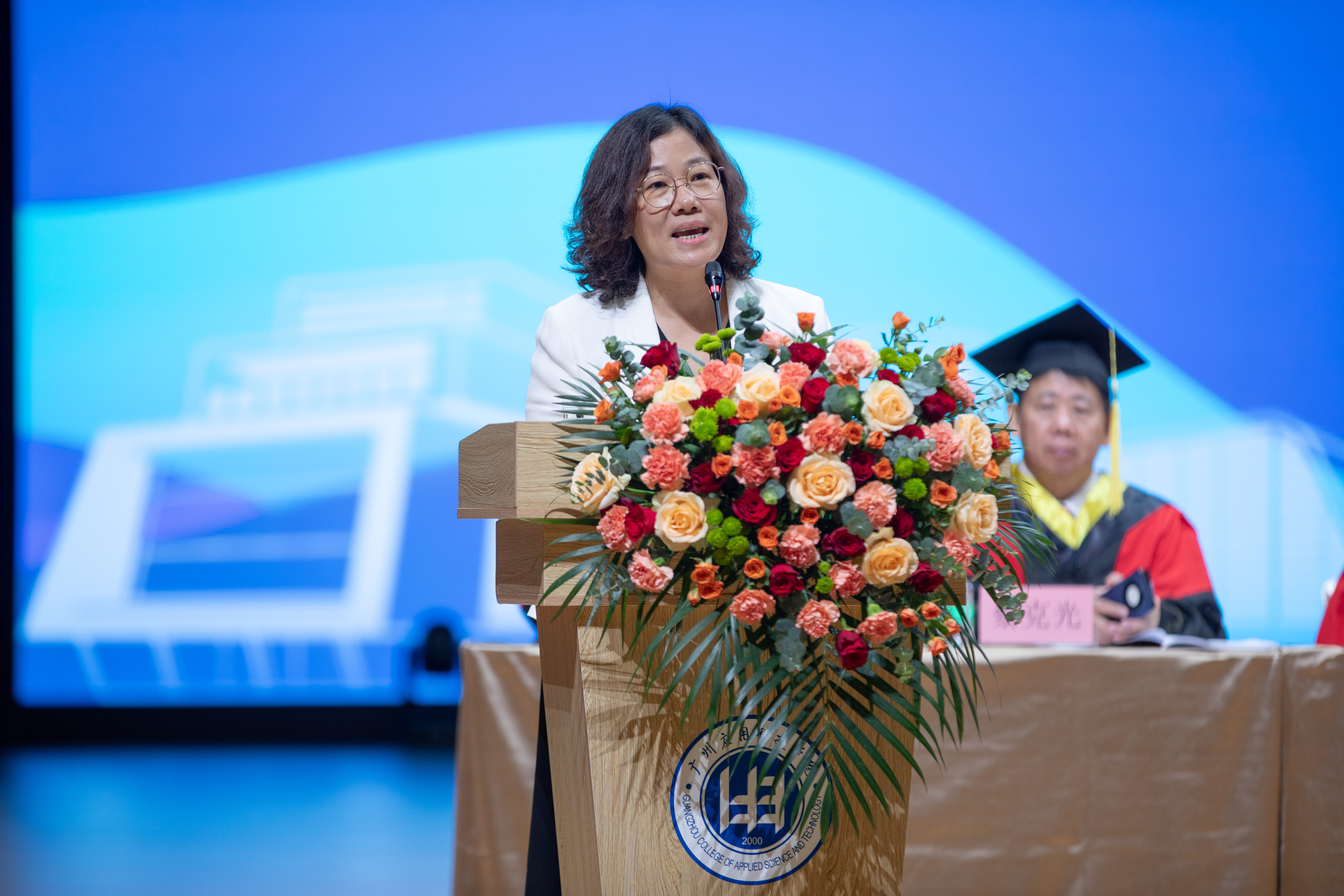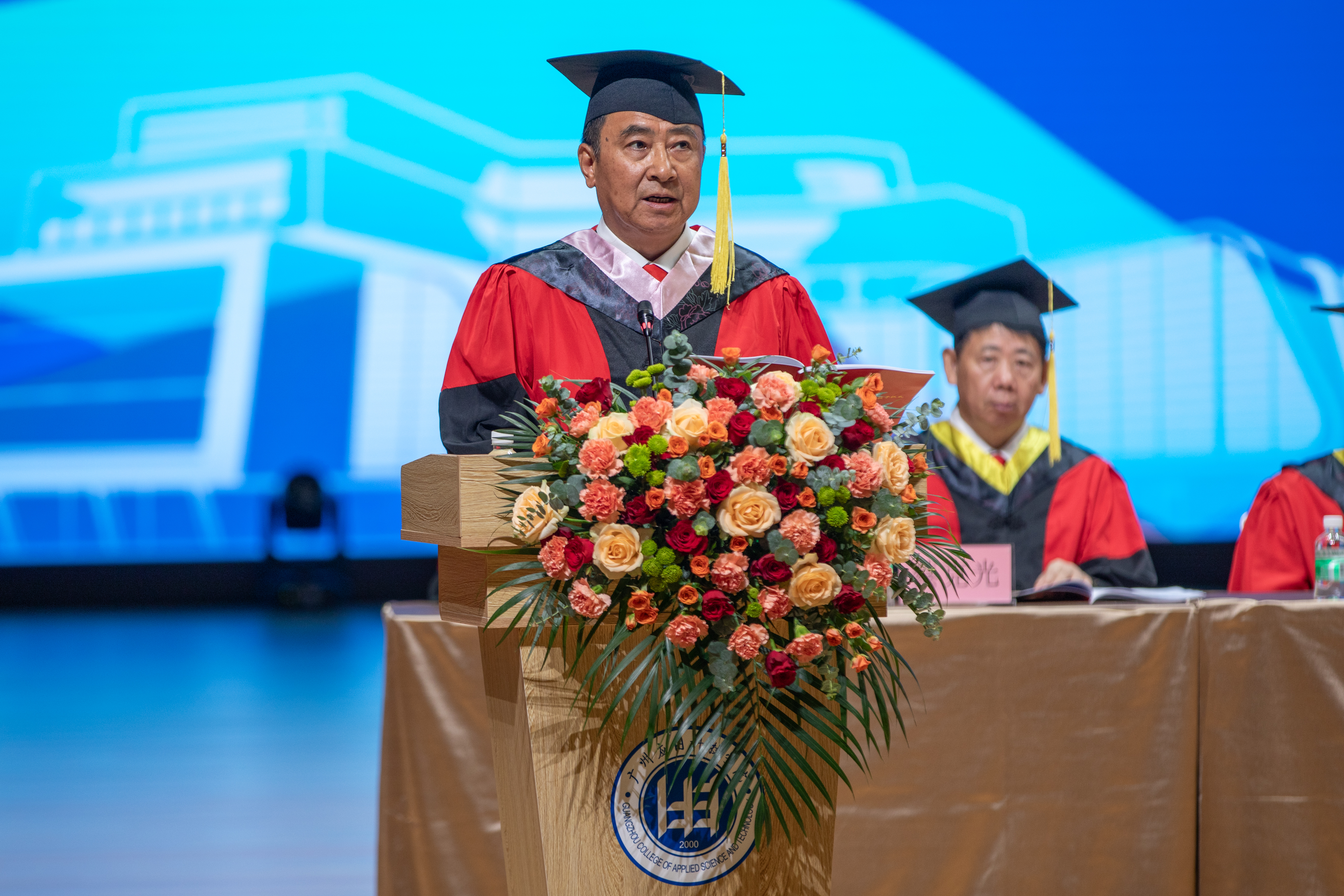 校长张光宇首先代表学校向圆满完成学业的8924名毕业生致以热烈祝贺,并向辛勤付出的老师、家长们表示崇高敬意和诚挚感谢。他深情回顾了学校在“十四五”期间取得的跨越式发展成就:连续四年入选“软科中国民办高校全国百强”,获批多项国家级、省级重要平台与荣誉;人才培养硕果累累,学生在“互联网+”等大赛中屡创佳绩,就业率持续领先;形成了具有广应科特色的“快-新-高”发展态势。