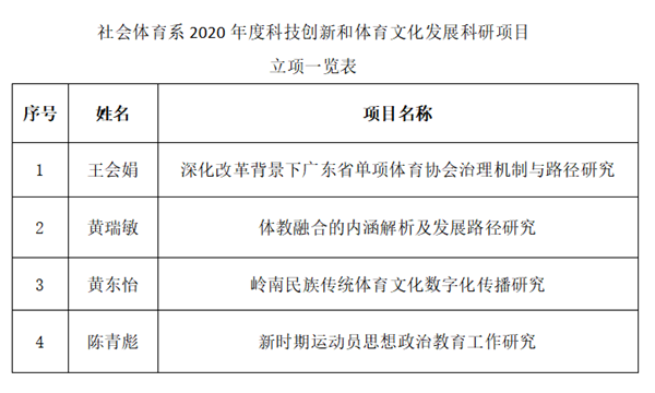 近日,广东省体育局发布“2020年度科技创新和体育文化发展科研项目”立项通知,我校社会体育系王会娟、黄瑞敏、黄东怡、陈青彪等4位老师的4项课题,获得广东省体育局2020年度科研项目课题立项,这也是该系来在省级体育科研项目上取得的历史性突破。