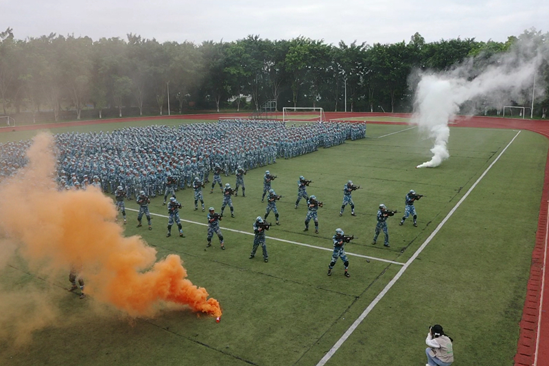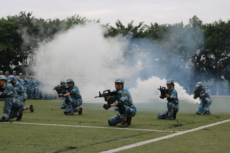 分列式上,随着一声响亮的口令,英姿飒爽的校旗护卫队、护送校旗迎面走向主席台;各院系组成的10个方阵,迈着整齐划一的步伐,依次通过主席台接受检阅。在军训汇演中,喊着最响亮的口号的女子匕首操、军事短棍术、军训功夫拳、花样方阵展示、反恐战术小组一一亮相。