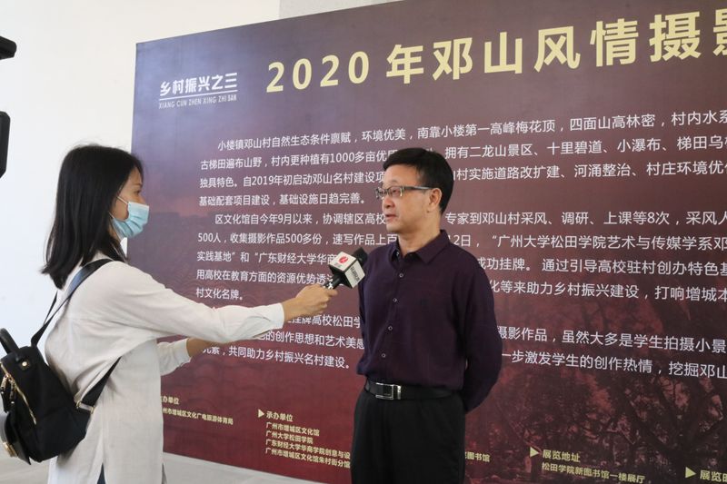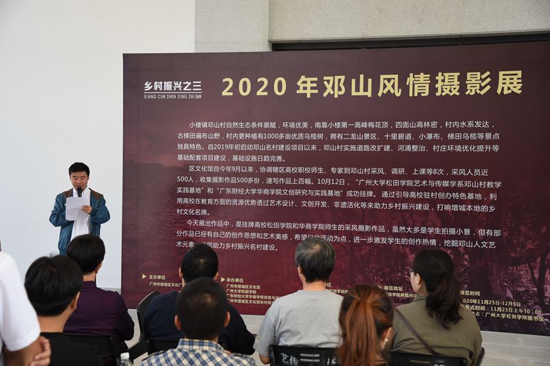 为探索“文化湾区”融合及地区文化建设与乡村振兴的关系,旨在践行习近平总书记“中华优秀传统文化是中华民族的文化根脉”,为加快乡村振兴推进工作,做好名村建设的的普广和宣传,提升增城区小楼邓山村的建设,11月25日上午,由广州市增城区文化广电旅游体育局主办,增城区文化馆和广州大学松田学院承办的“2020年邓山风情摄影展”开幕式在我校新图书馆一楼展厅举行。