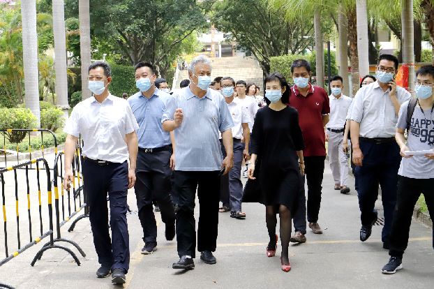 ▲ 林怡辉副区长(前左三)在我校校长庞永师(前左二)的陪同下检查疫苗接种全流程。