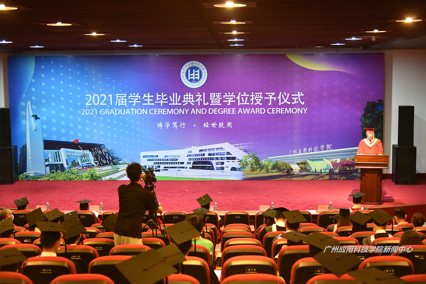 广州应用科技学院(原广州大学松田学院)2021届学生毕业典礼暨学士学位授予仪式,6月28日上午在广州校区行政楼多功能厅举行,2942名学子挥别母校,开启人生新的征程。本次毕业典礼以线下精心呈现、线上同步直播的形式举行,利用多媒体直播观看通道及平台打造了别开生面的“云毕业典礼”。