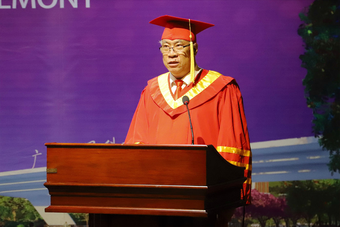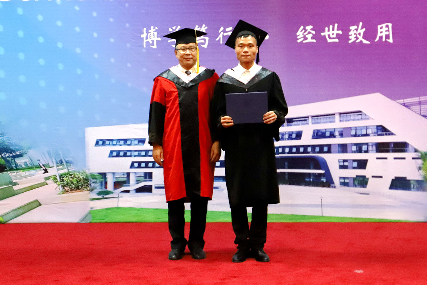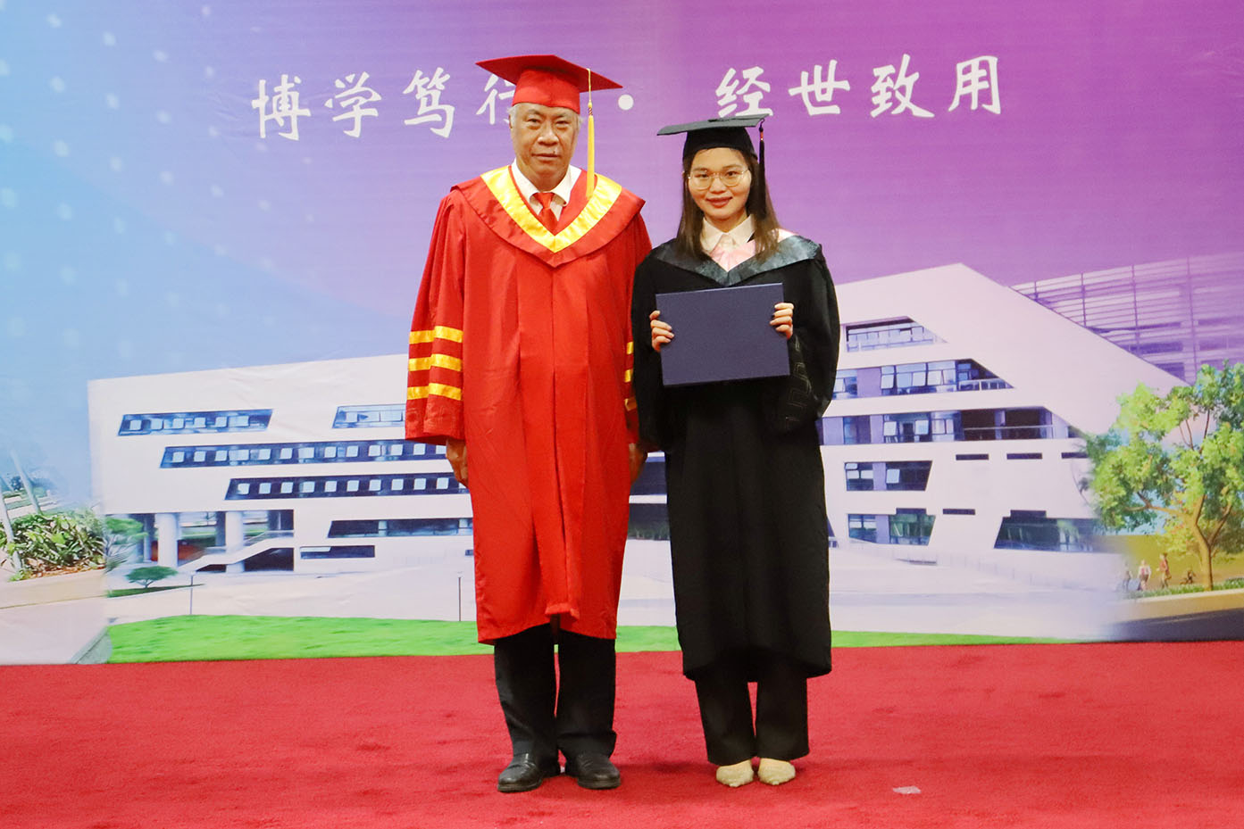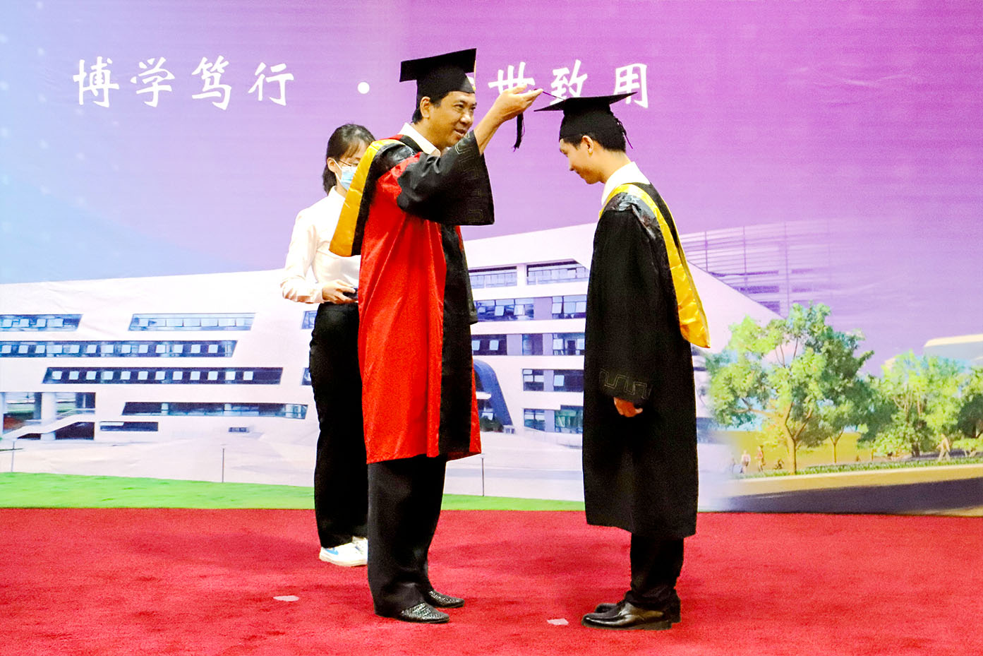 谢可滔主席亲自莅临今年的毕业典礼。在仪式现场,随着谢可滔主席、刘剑锋董事长,以及校领导为2021届毕业生代表分别拨穗,我校转设更名后首届毕业生的本科毕业证正式颁出。