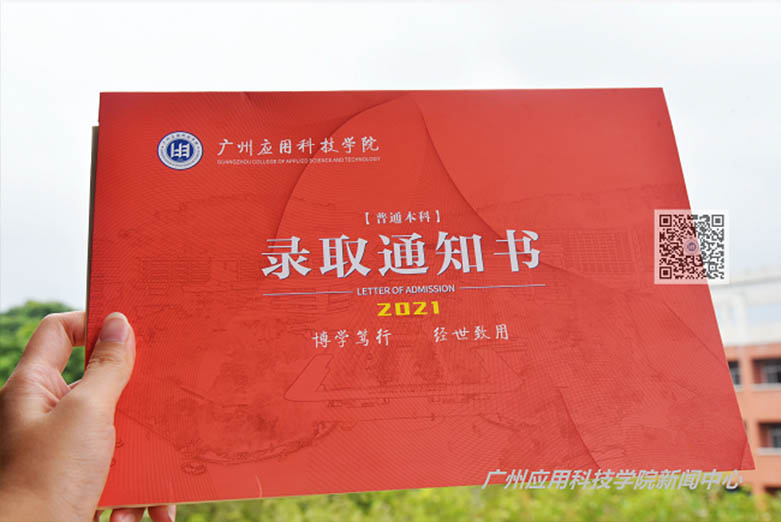 翻开内页,庄重的设计工艺下,我校董事长、校长刘剑锋亲笔签发的2021级新生录取通知书,加盖学校红色印章,通过纸张与文字,跨越山海与时间,传递到每位广州应用科技学院新生手中。